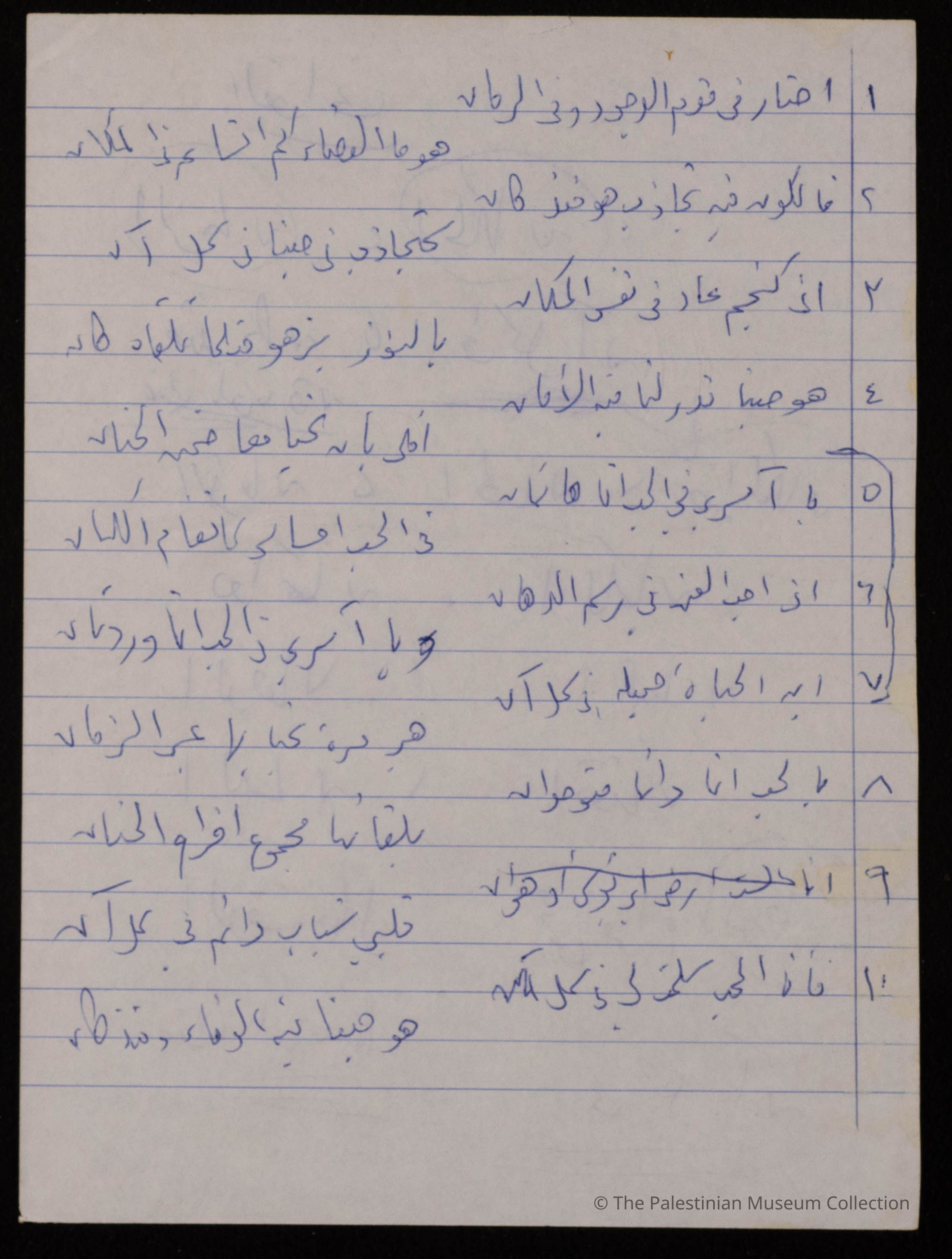 مخطوطة قصيدة باللغة العربية بلا عنوان للشاعرة فاطمة المحب، ولا تحمل الوثيقة اية اشارة الى تاريخ كتابتها.