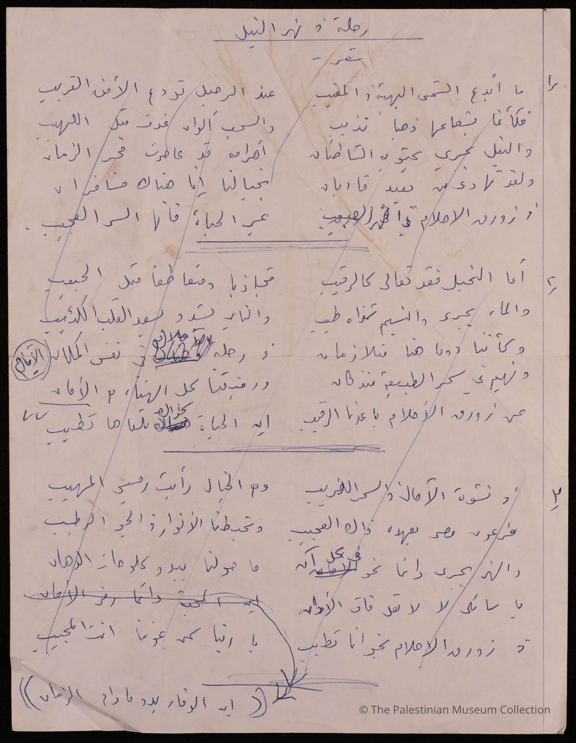 مخطوطة قصيدة باللغة العربية بعنوان "رحلة في نهر النيل" للشاعرة فاطمة المحب، وقامت الشاعرة بخدفها جميعها، ولا تحمل الوثيقة اية اشارة الى تاريخ كتابتها.