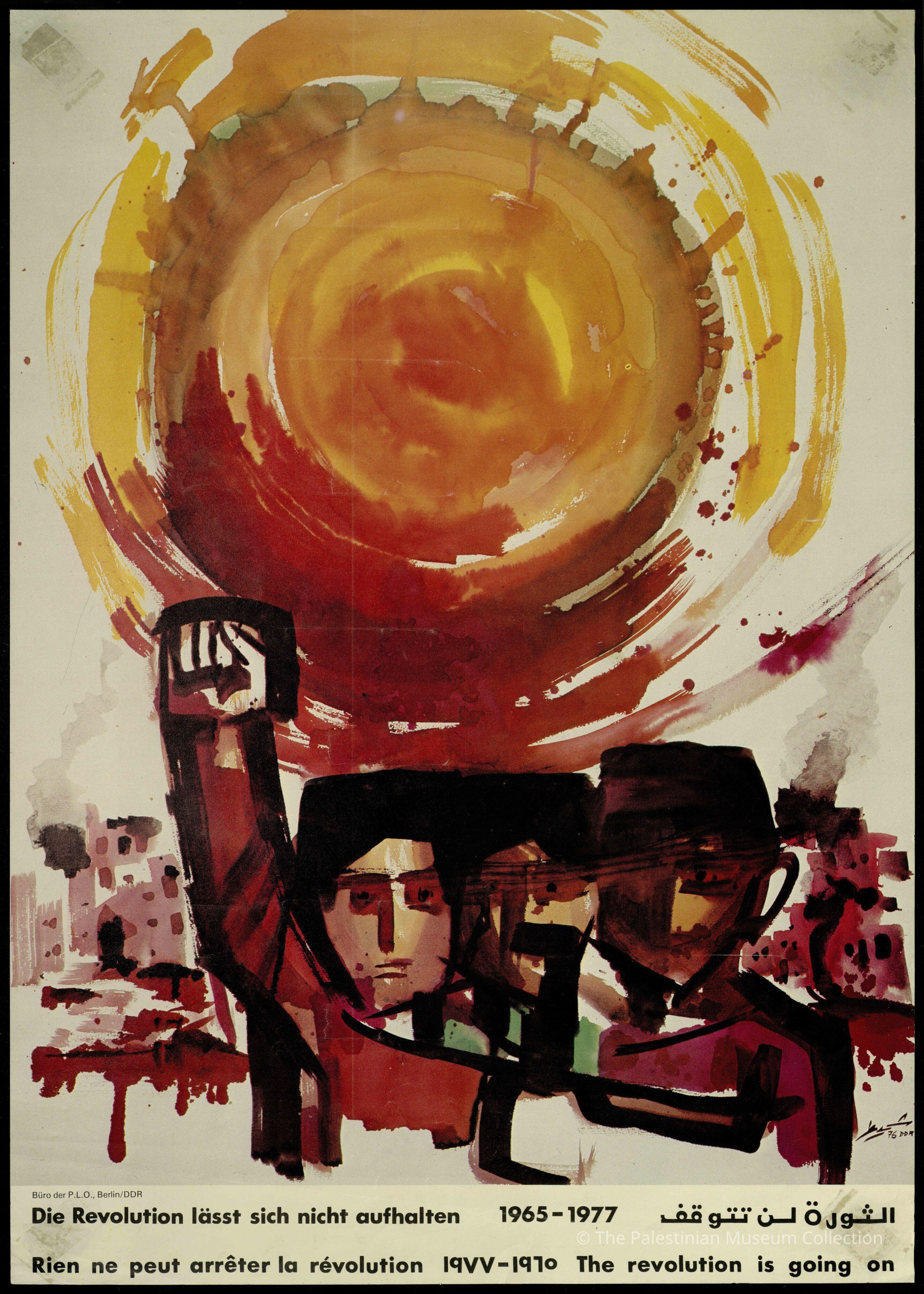 A poster entitled 'The revolution is going on' issued by the Palestine Liberation Organisation (PLO) Bureau in East Berlin dedictaed to the German Democratic Republic (DDR) in 1977. It features 1976 artwork by the artist Ismail Shammout. The phrase at the bottom of the poster was translated into English, French, and German.Dimensions
