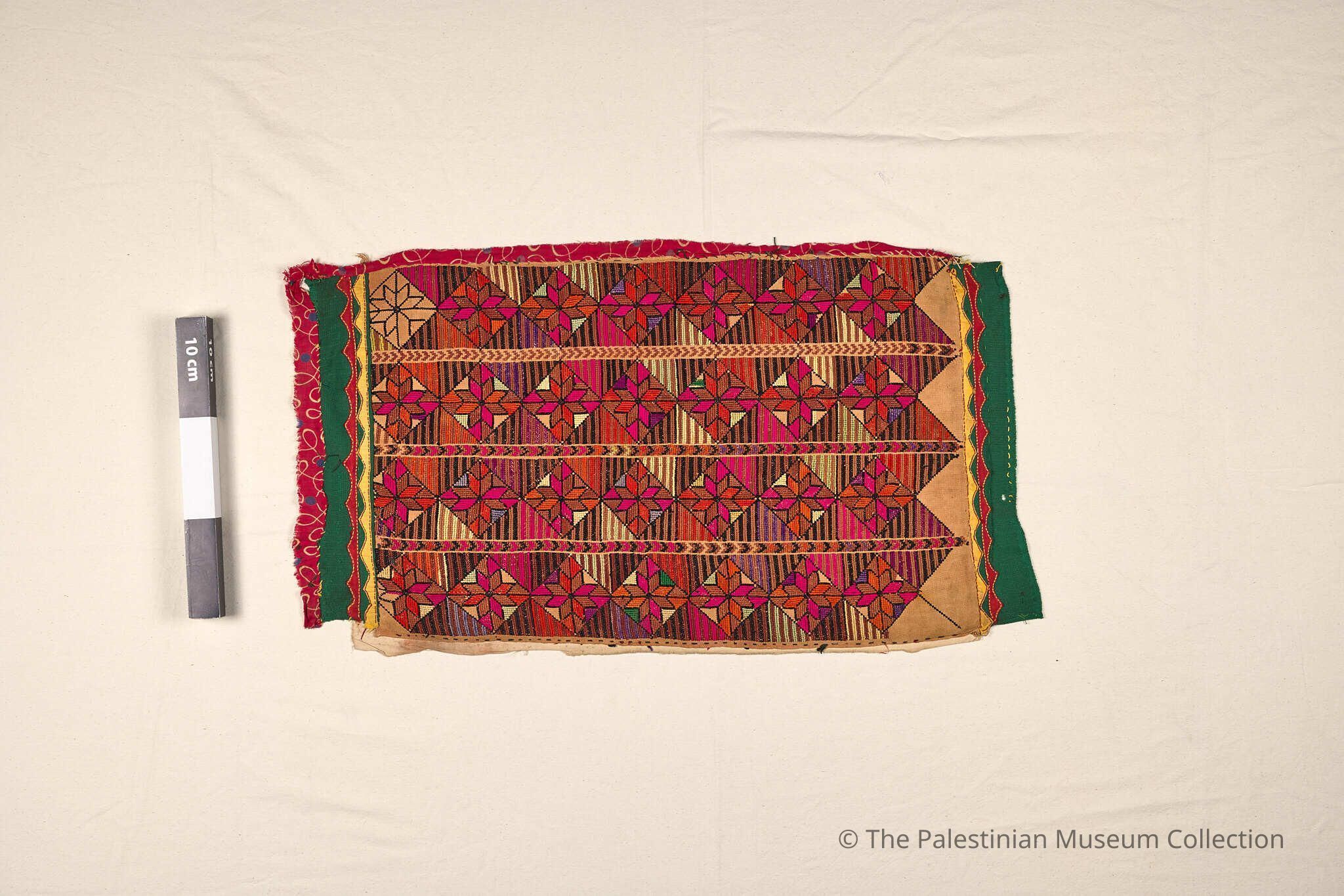 A pillowcase from the southern Hebron region, rectangular and made of linen, cotton, and etamine in beige, green, and red. It is heavily embroidered with geometric shapes and the star of Bethlehem motif in the Fallahi (peasant) cross stitch using red, orange, fuchsia, black, and blue silk threads.Made/Created