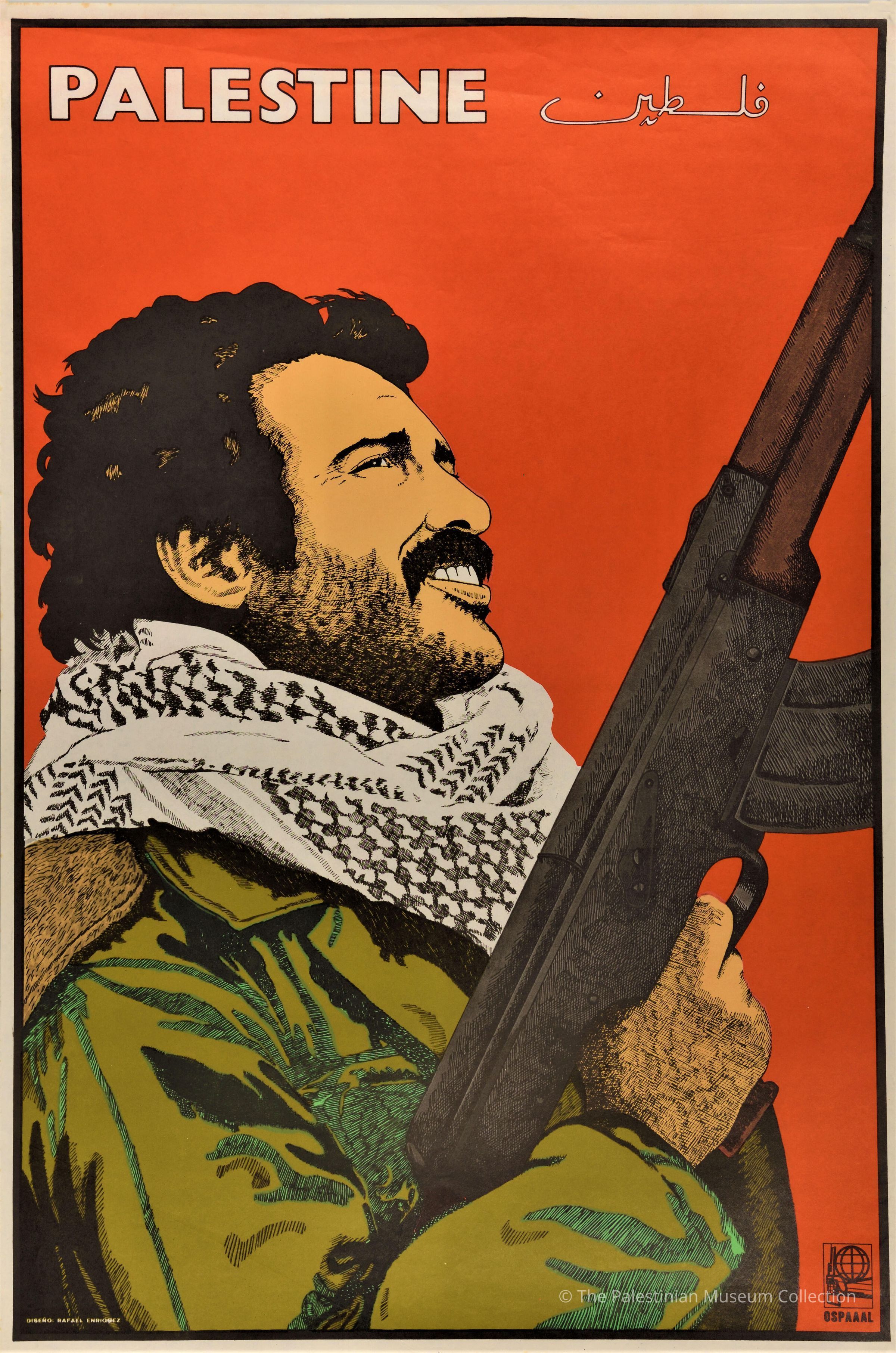 ملصق ملون، عبارة عن رسمة لمقاتل يرتدي الزي العسكري والكوفية الفلسطينية، ويحمل البندقية A colour poster showing a drawing of a man in a military uniform and a Kufiya holding a rifle.