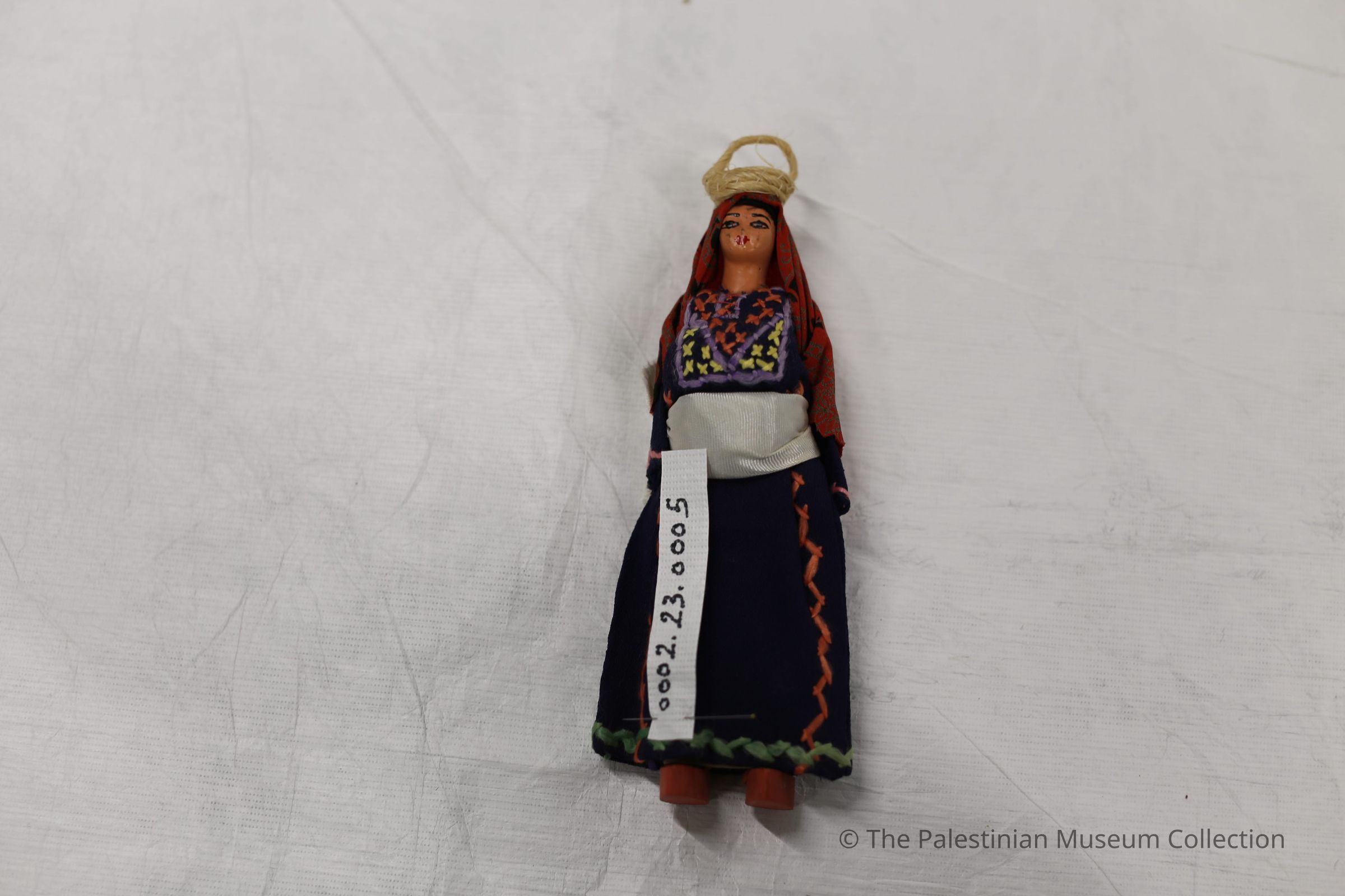 دمية صغيرة الحجم مصنوعة من الخشب والاسلاك ترتدي ثوب تراثي من القماش القطني ذو اللون الكحلي عليه تطريز خفيف من منطقة القبة وعلى راسها ترتدي شال احمر وفوقه سلة من الخيوط وكذلك ترتدي حزام قماشي.Made/Created