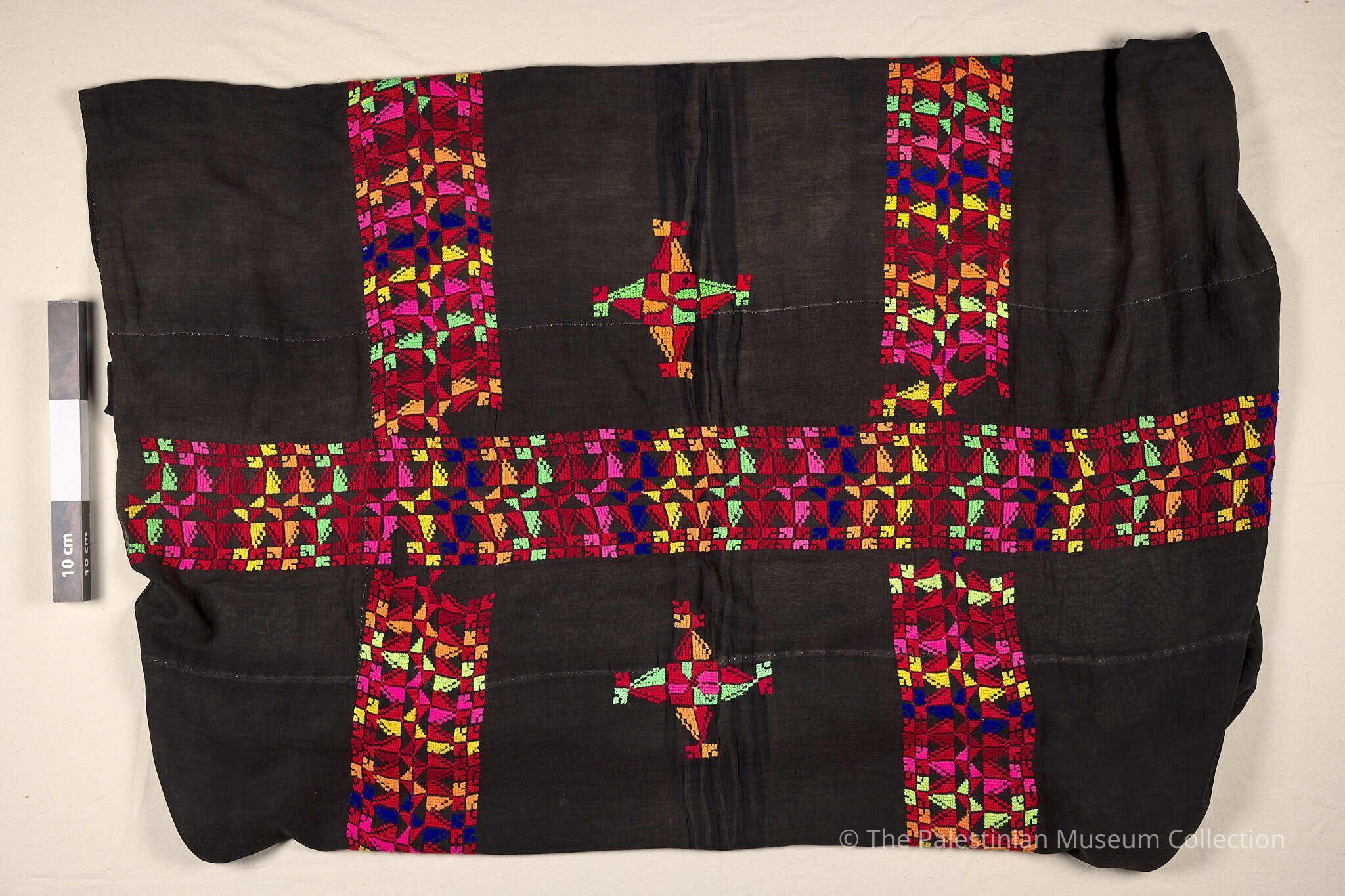 Qun'a Shawl from Al-Naqab area which would be worn on the bride's head when riding a camel. It is made of black cotton and embroidered with multi-coloured silk threads in geometric and plant shapes along with cypress and fans motifs.Made/Created