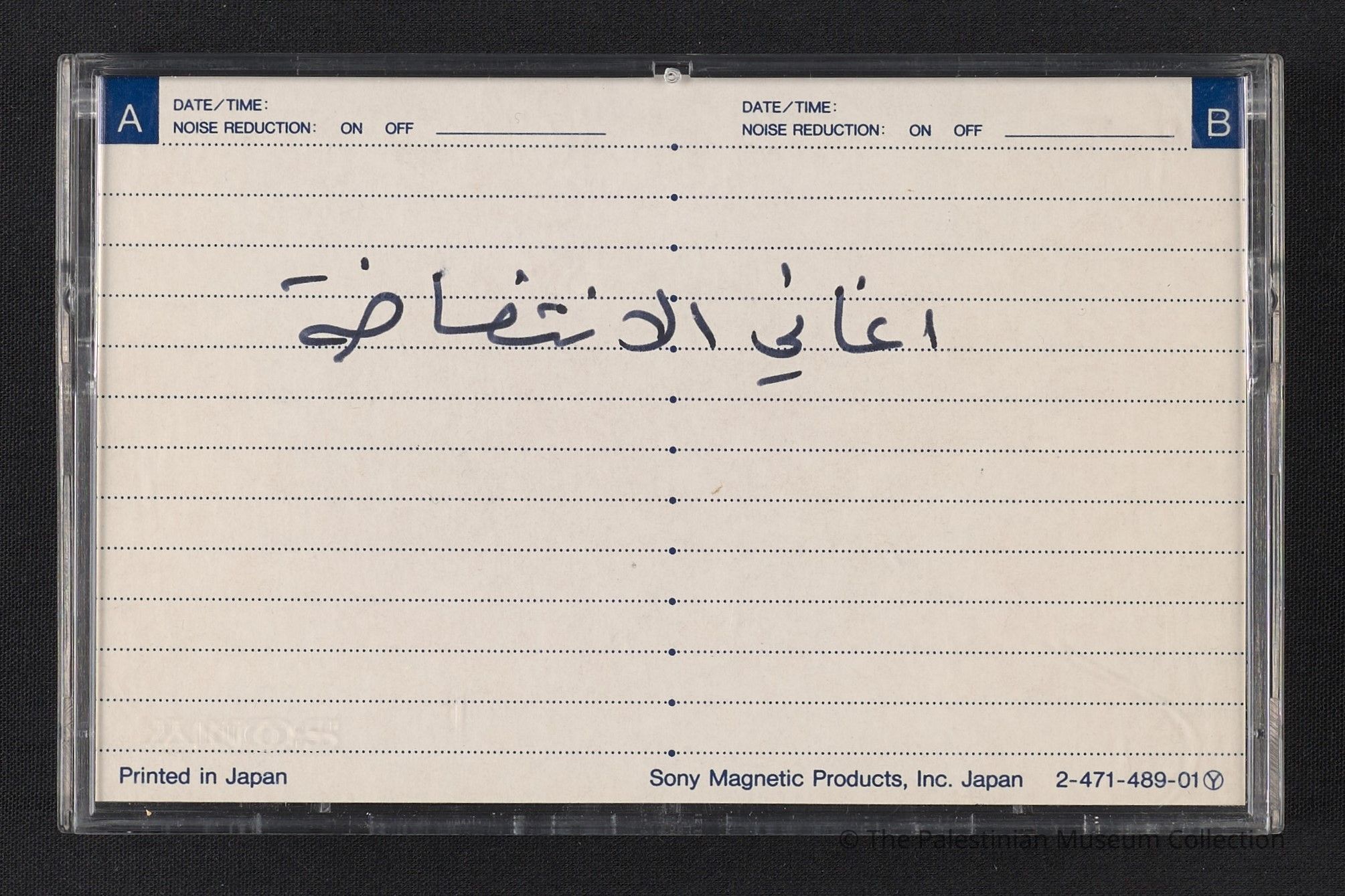 شريط صوتي، كاسيت غنائي وطني، بعنوان أغاني الإنتفاضة، باللغة العربية، يتناول اغاني وطنية وشعبية وثورية، كتب على الغلاف اسم الشريط باللغة العربية.Dimensions