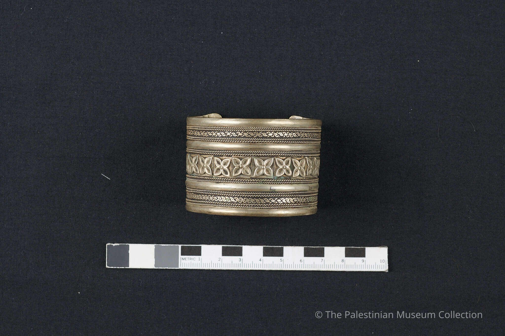 إسورة عريضة من الفضّة، مُزخرفة ومنقوشة في الوسط بصفّ من الورود، وهي بلا قفل، ومفتوحة من الخلف، وفي نهايتَيها ما يشبه الأسنان.