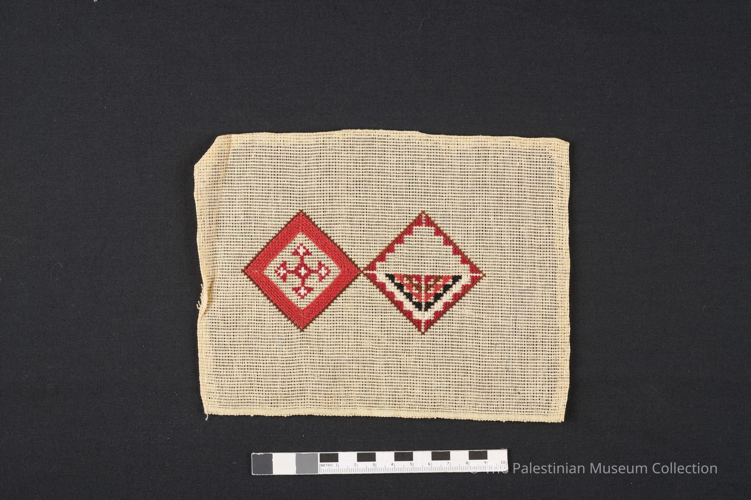 نموذج تطريز على قماش ايتامين بحرير احمر واسود وبني برسمات بشكل معين