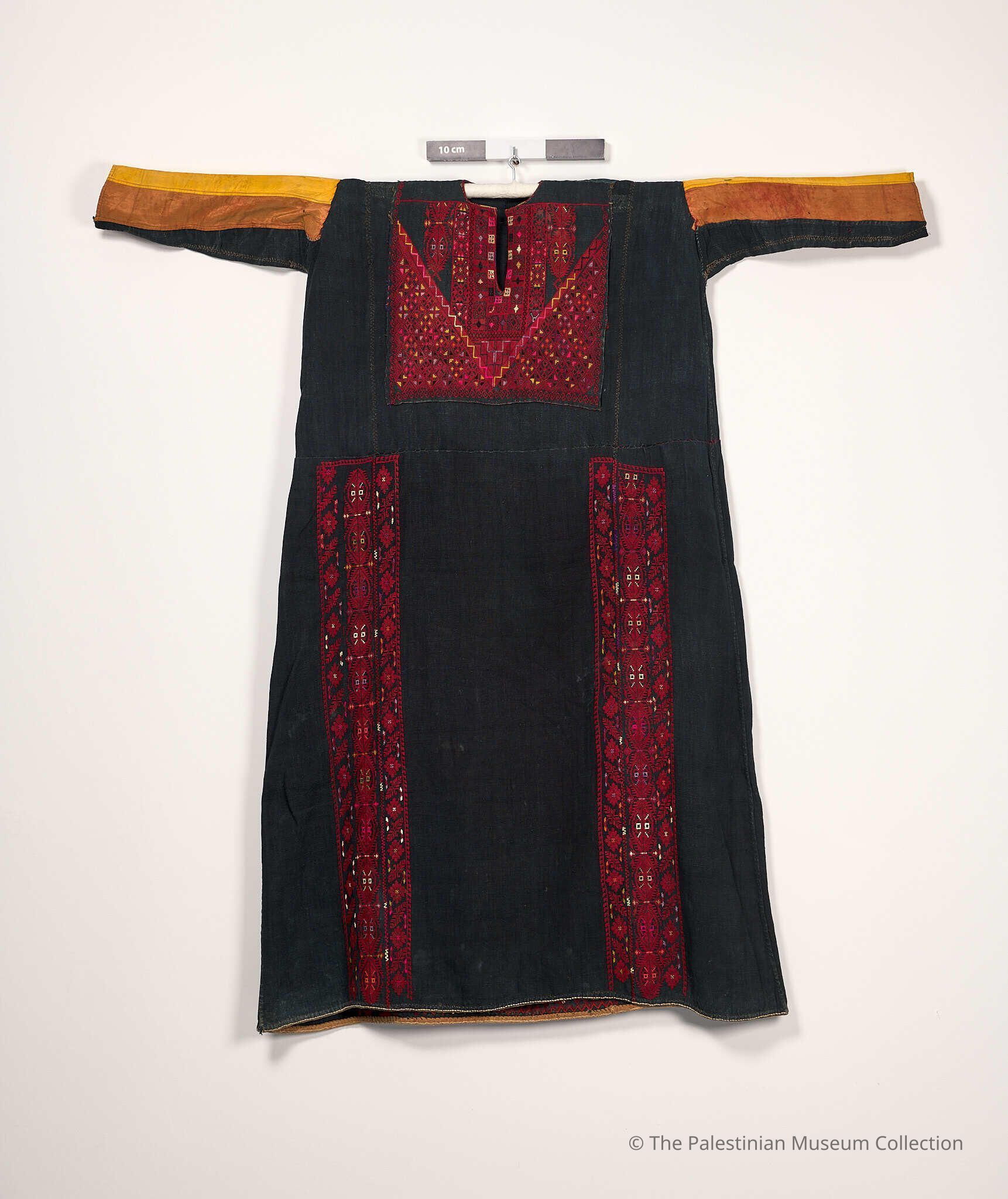A black Rumi thobe (Roman dress) from Ramallah. It is made of linen and embroidered with primarily red silk threads with a Fallahi (peasant) cross stitch. The chest panel is heavily embroidered with plant and geometric shapes. As for the shoulders and the back panel of the thobe (the upper back neckline), they bear no embroidery. Part of the sleeves is made of yellow and orange silk (heremzi). The front and back panel of the thobe are embroidered with two parallel stitch patterns of plant and geometric shapes and feather motifs. The sides (Al-Banayiq) have no tatreez (embroidery).Made/Created