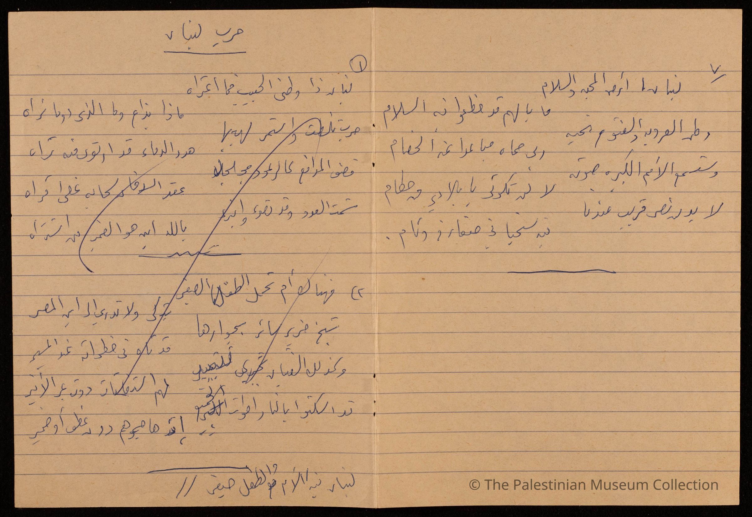 مخطوطة قصيدة باللغة العربية بعنوان "حرب لبنان" للشاعرة فاطمة المحب، ولا تحمل الوثيقة اية اشارة الى تاريخ كتابتها
