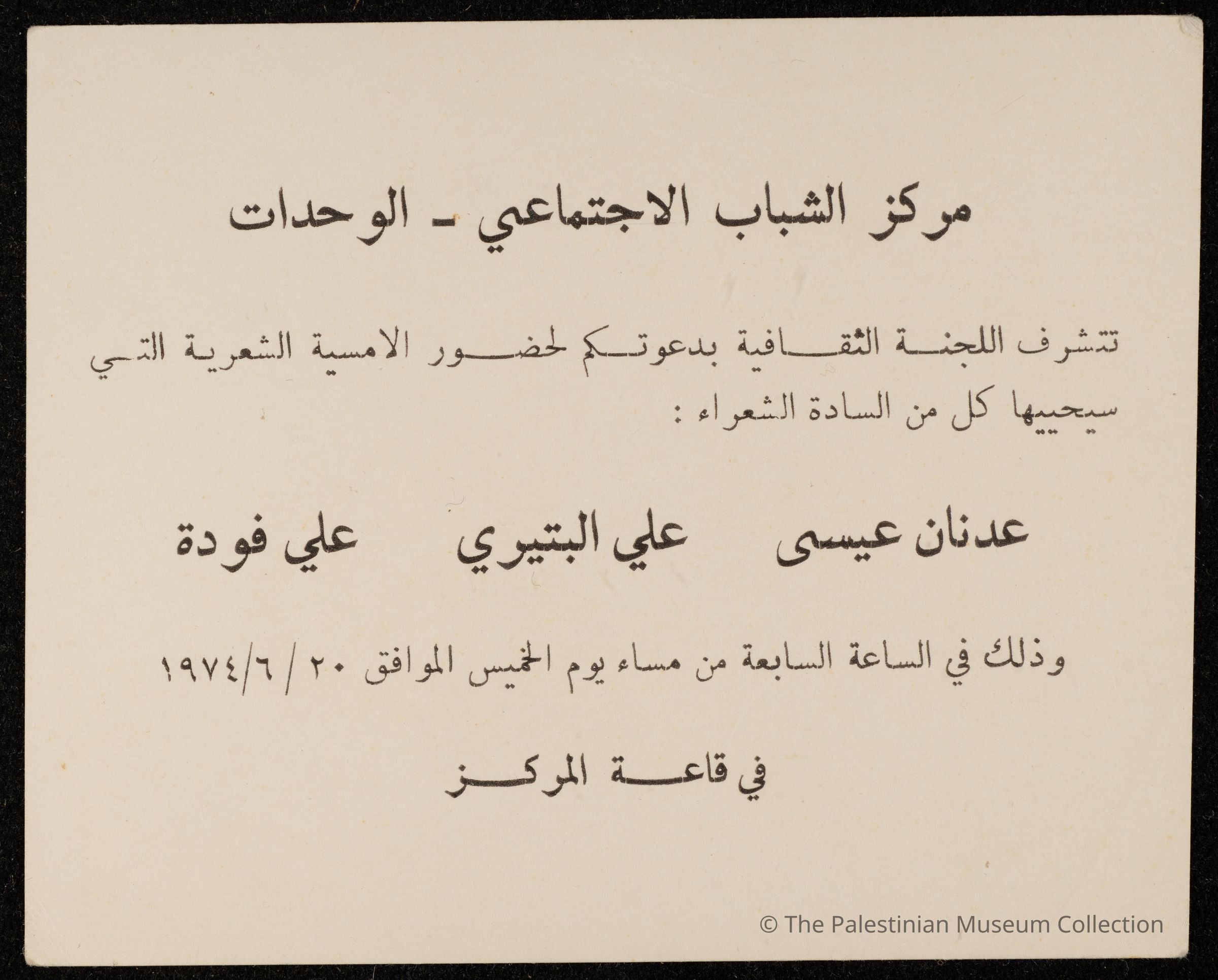 دعوة من اللجنة الثقافية في مركز الشباب الاجتماعي - الوحدات، تحتوي على دعوة لحضور امسية شعرية يحيها عدنا عيسى وعلي البتيري وعلي فودة في قاعة المركز.