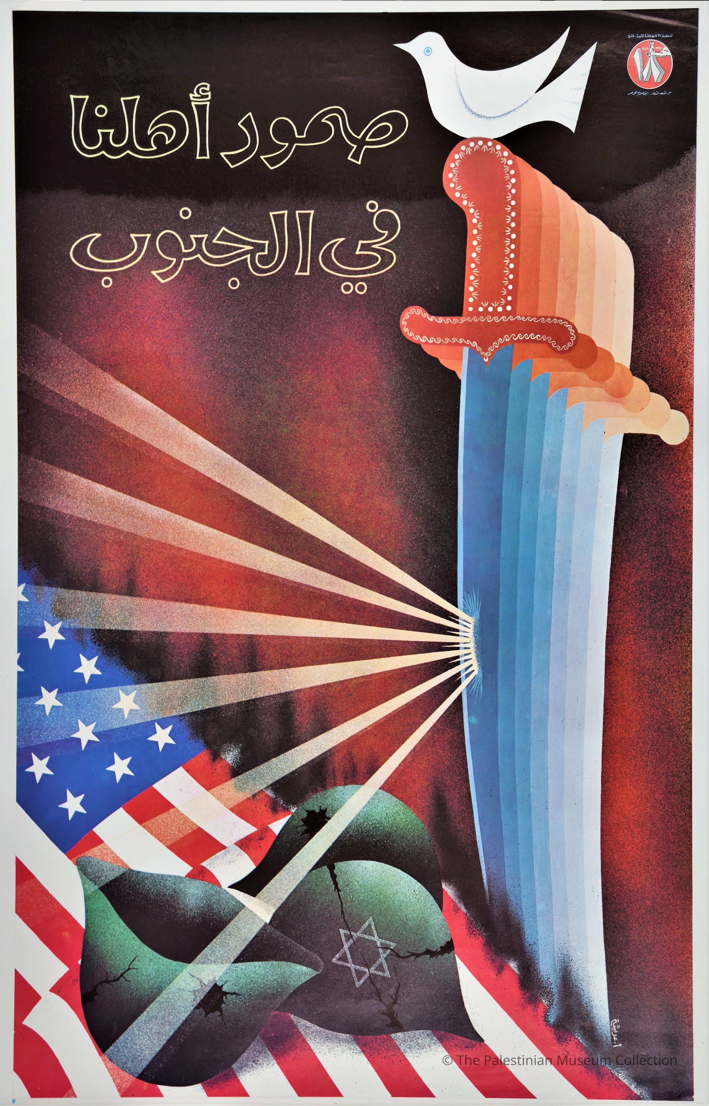 A colour poster showing a white pigeon standing over a sword stabbing the USA flag; with military helmets, and a shattered Star of David printed on them, all over it. The poster was published on the occasion of confronting of the Israeli Attack in south Lebanon.Dimensions