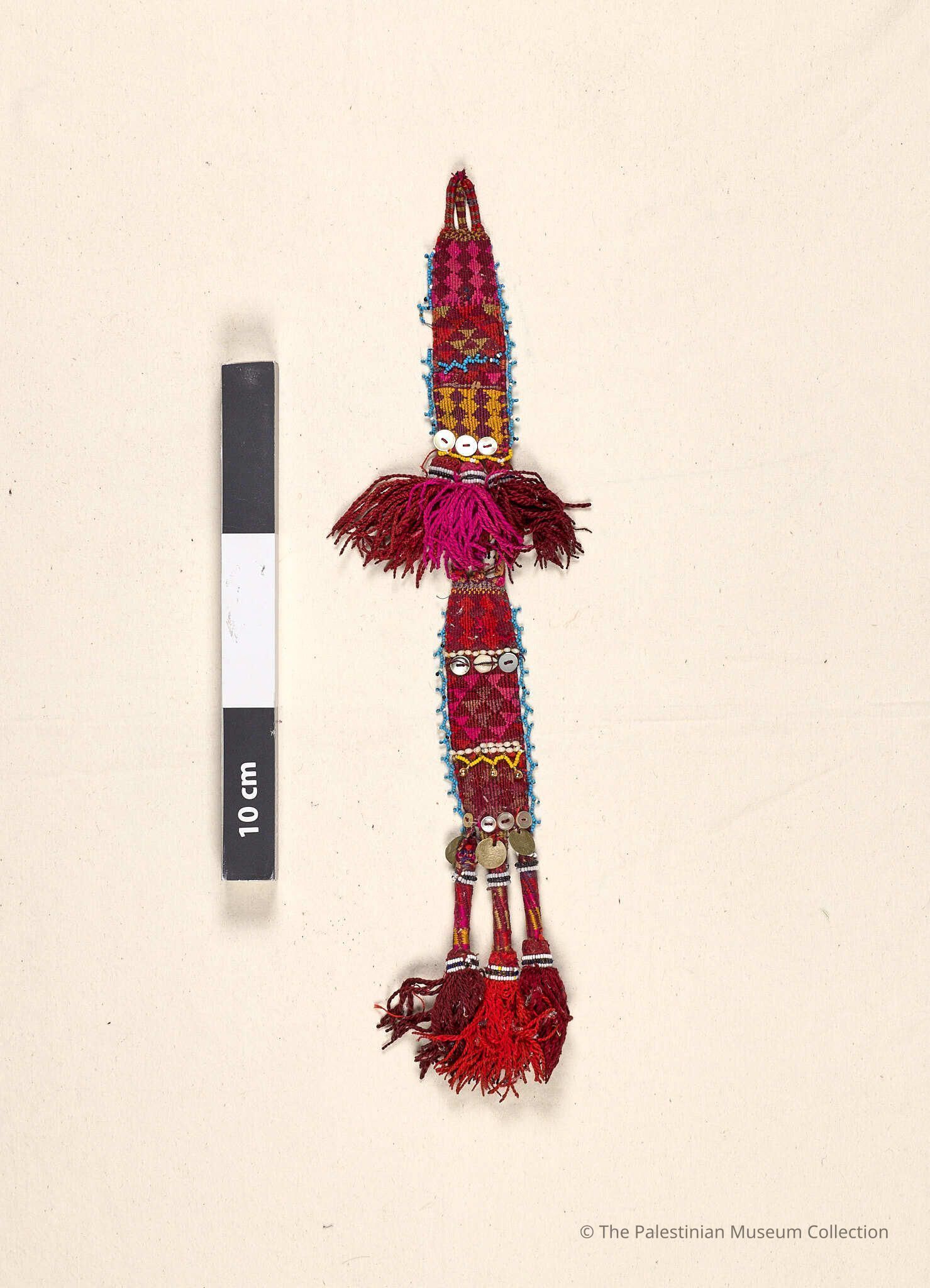 Qarmula (hair tie) made of silk and wool and stitched with buttons and blue beads. The qarmula is topped with shells that are tied in braids to decorate the chest. The threads are made of red, orange, yellow, and purple wool, and tassels adorned with white and blue beads, buttons, and coins hang from its middle and ends.Made/Created