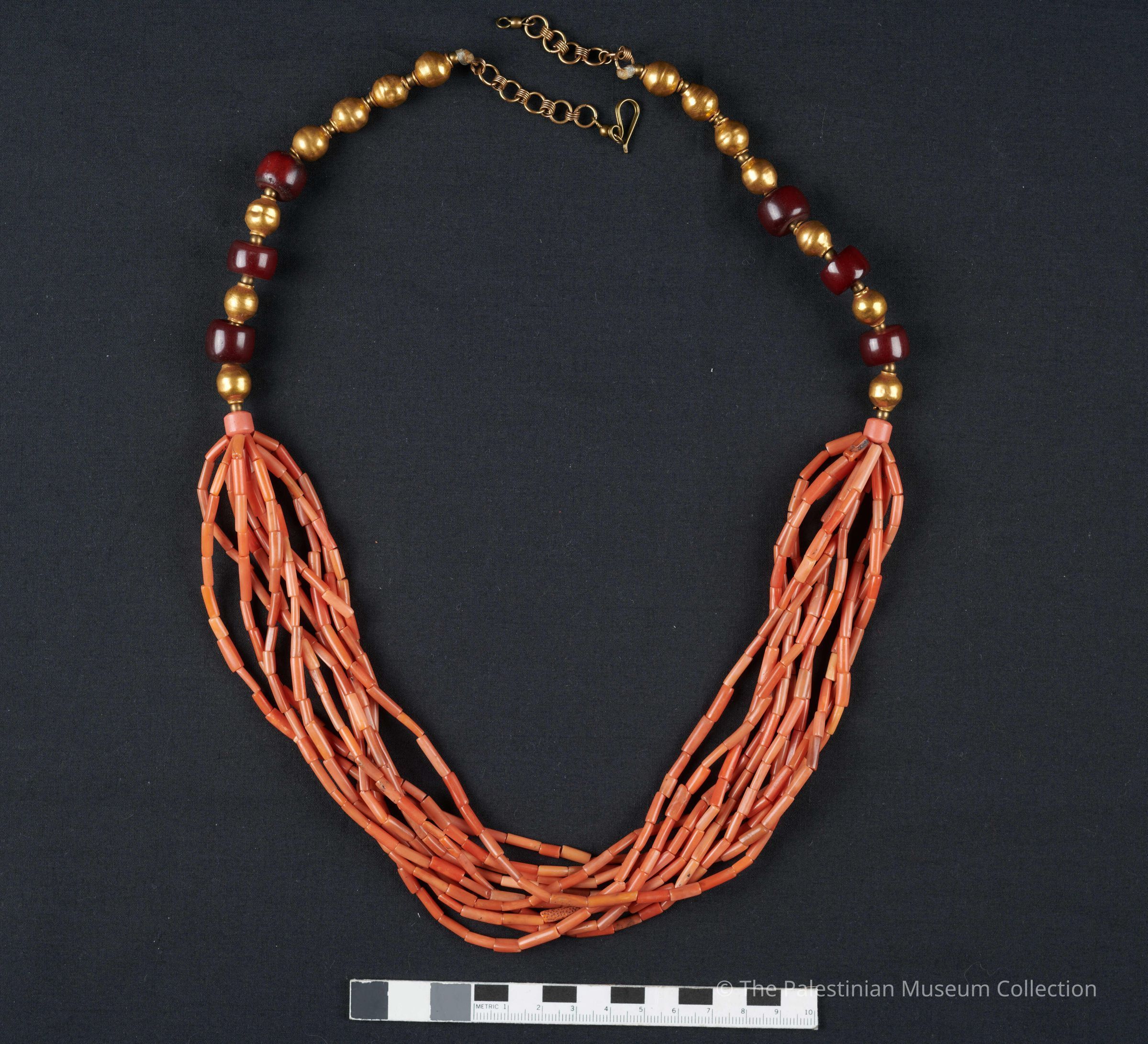 عقد (قلادة) مصنوع من عدّة صفوف من المرجان، مربوطة معًا بسلسلة فيها خرزات من العنبر الأحمر وأُخرى ذهبيّة، تنتهي بسلسلة صغيرة وقفل