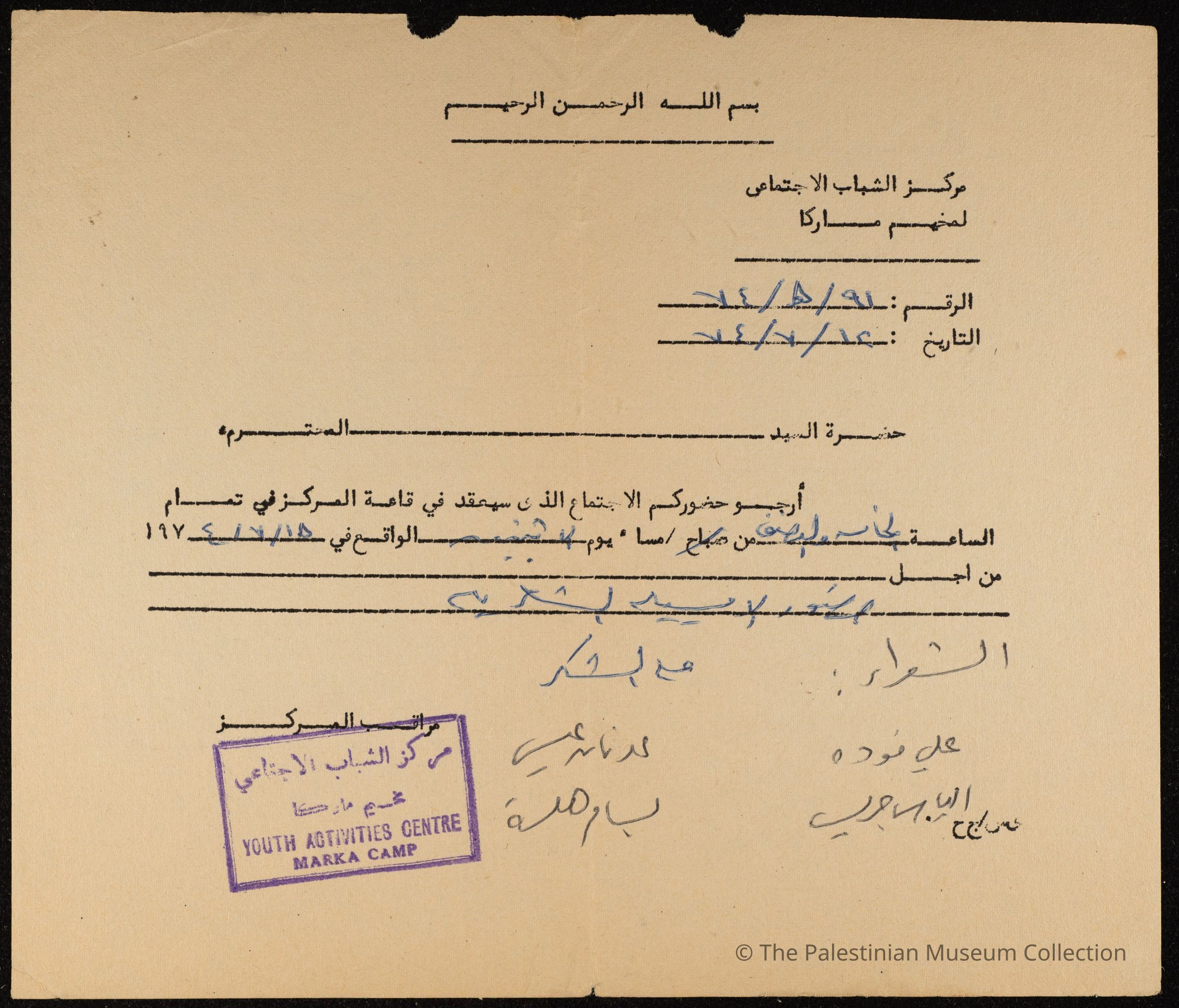 دعوة مقدمة من مركز الشباب الاجتماعي للسيد علي فودة بتاريخ 12\7\1974م لحضور الأمسية الشعرية التي ستُعقد في قاعة المركز.