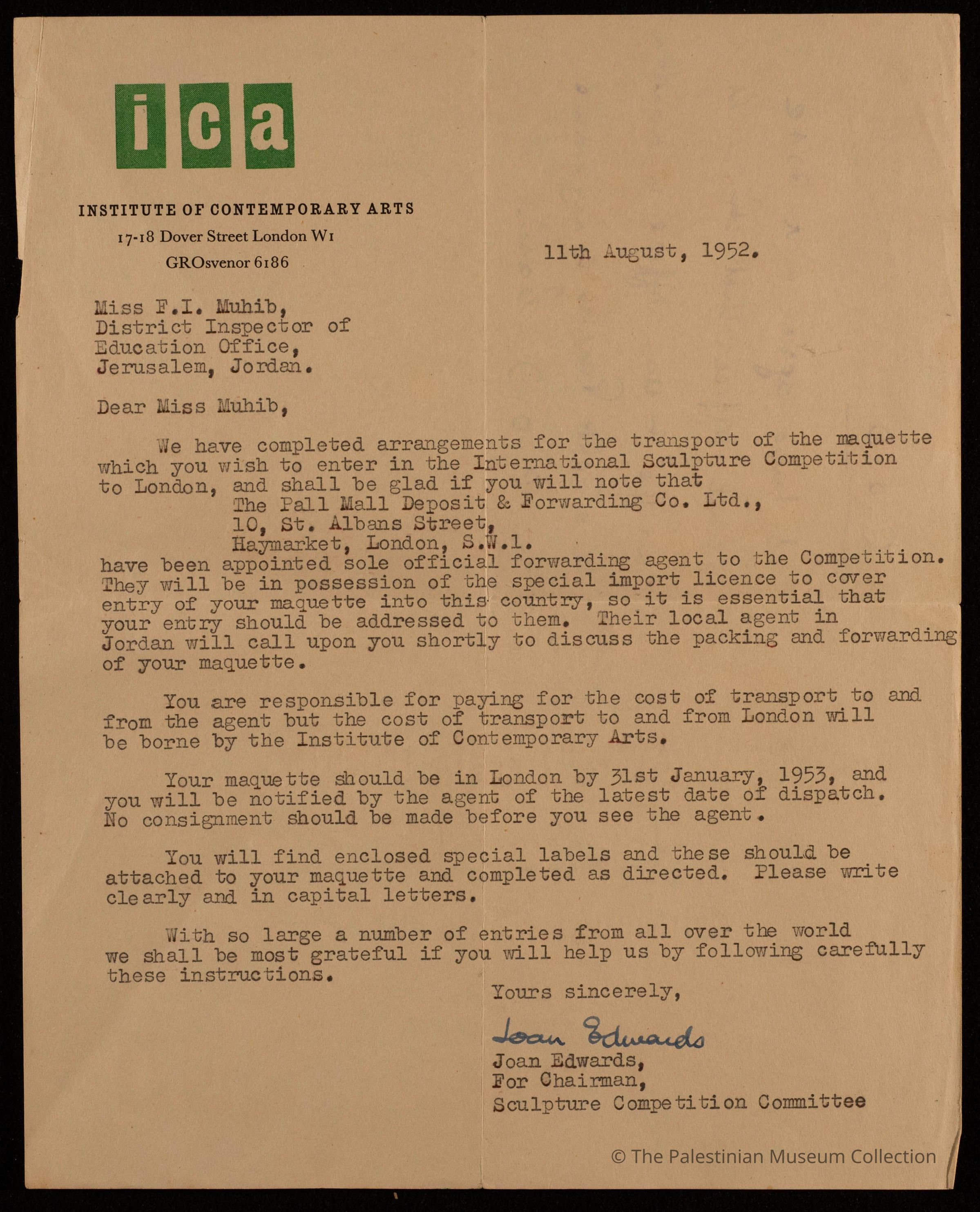 An official letter from the Institute of Contemporary Arts addressed to Fatima Muhib, Inspector of Education in Jerusalem, on 11 August 1952. The letter contains arrangements for the transport of a model sculpture that Miss Muhib wishes to present at the International Sculpture Competition in London.