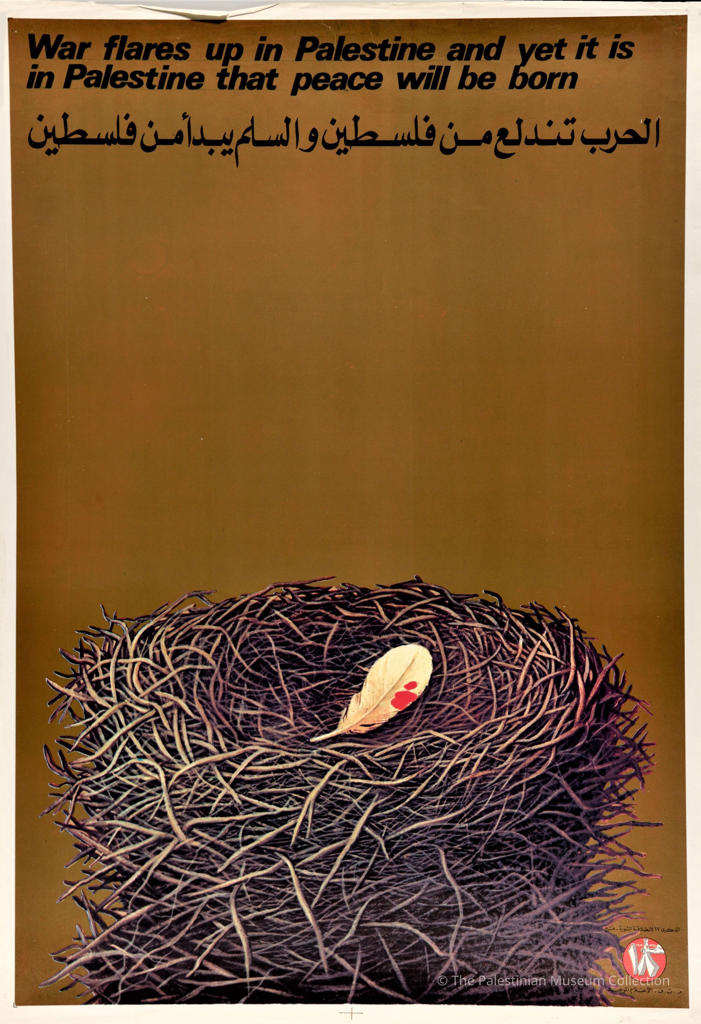 This poster entitled 'War flares up in Palestine and yet it is in Palestine that peace will be born' was issued by the Unified Information Office of the Palestine Liberation Organisation (PLO) in 1982 to commemorate the 17th anniversary of the Palestinian Revolution.Dimensions