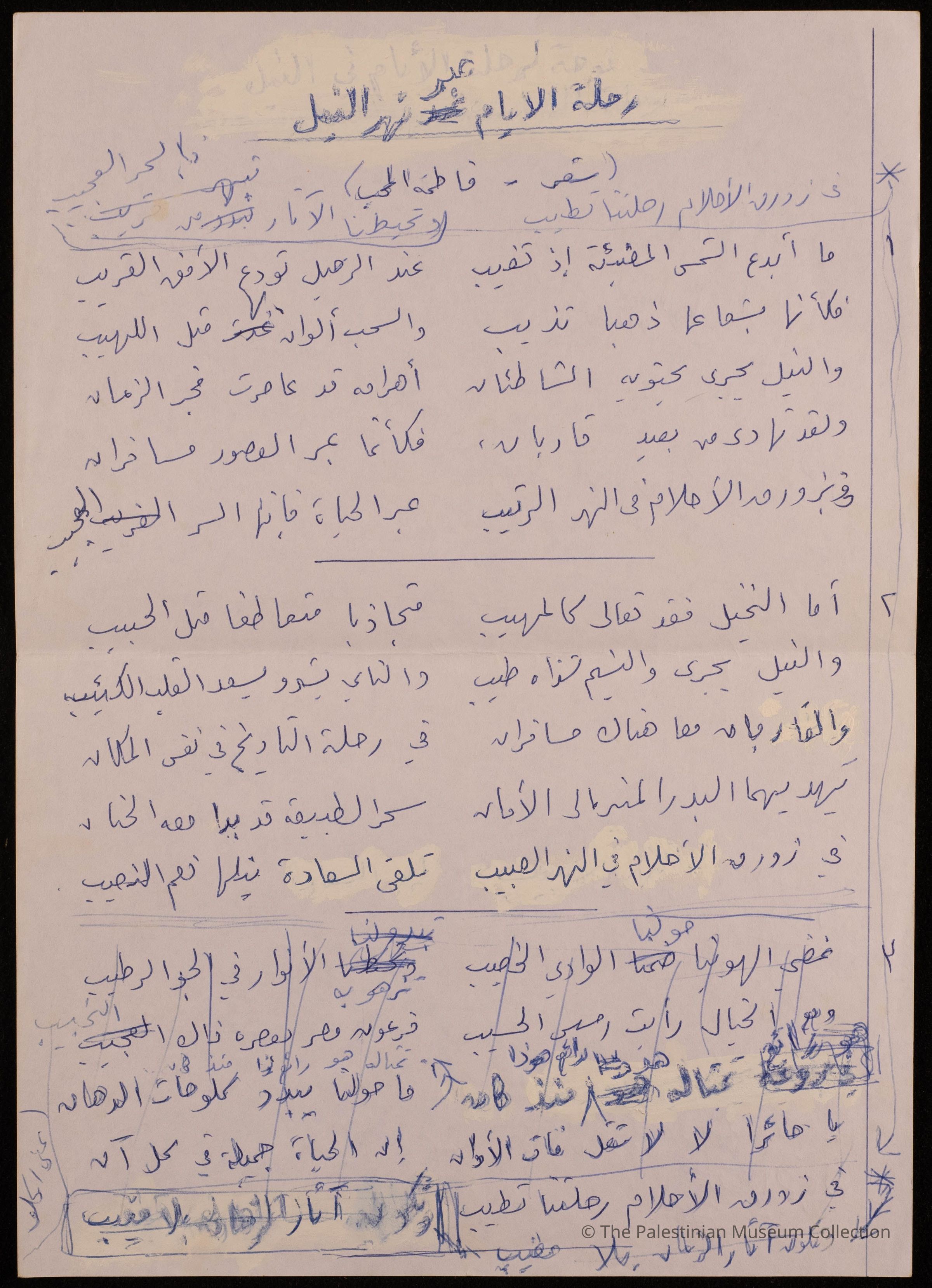 مخطوطة قصيدة باللغة العربية بعنوان" رحلة الايام غبر نهر النيل" للشاعرة فاطمة المحب، ولا تحمل الوثيقة اية اشارة الى تاريخ كتابتها.