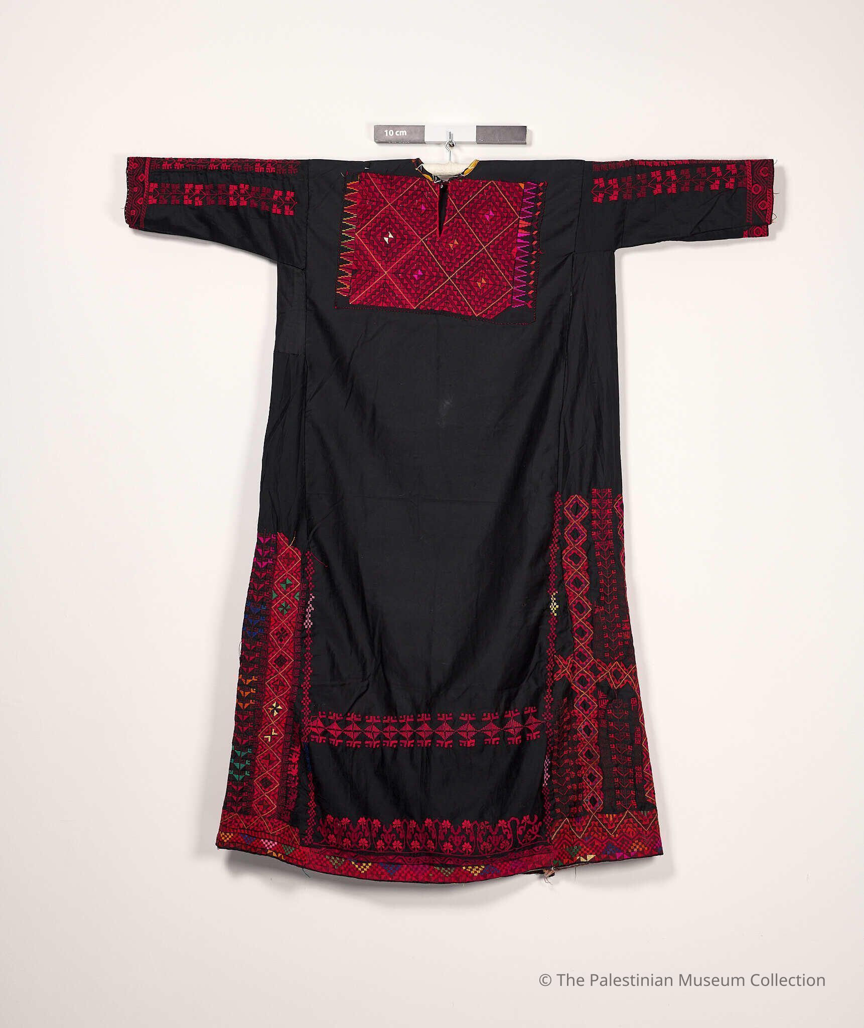 A thobe (dress) from Bir Saba’. It is made of black cotton and embroidered with primarily red silk threads. The chest panel of the thobe is embroidered with Pasha’s tent motifs framed by cypress motifs. As for the Nayashin (medal) and the back of the chest panel (the upper back neckline), they bear no embroidery. The sleeves have a tatreez (embroidery) of feather motifs and plant shapes, whereas the cuffs have a tatreez of geometric shapes. The front panel of the thobe has a light tatreez of feather, fans, amulets, grape leaves, and rose pots motifs, whereas the back panel is heavily embroidered with Pasha’s tent motifs and geometric shapes. The sides (al-Banayiq) are embroidered with feather, Pasha’s tent, amulets, grape leaves motifs along with plant and geometric shapes. Additionally, the tail of the thobe is embroidered with geometric shapes.Made/Created