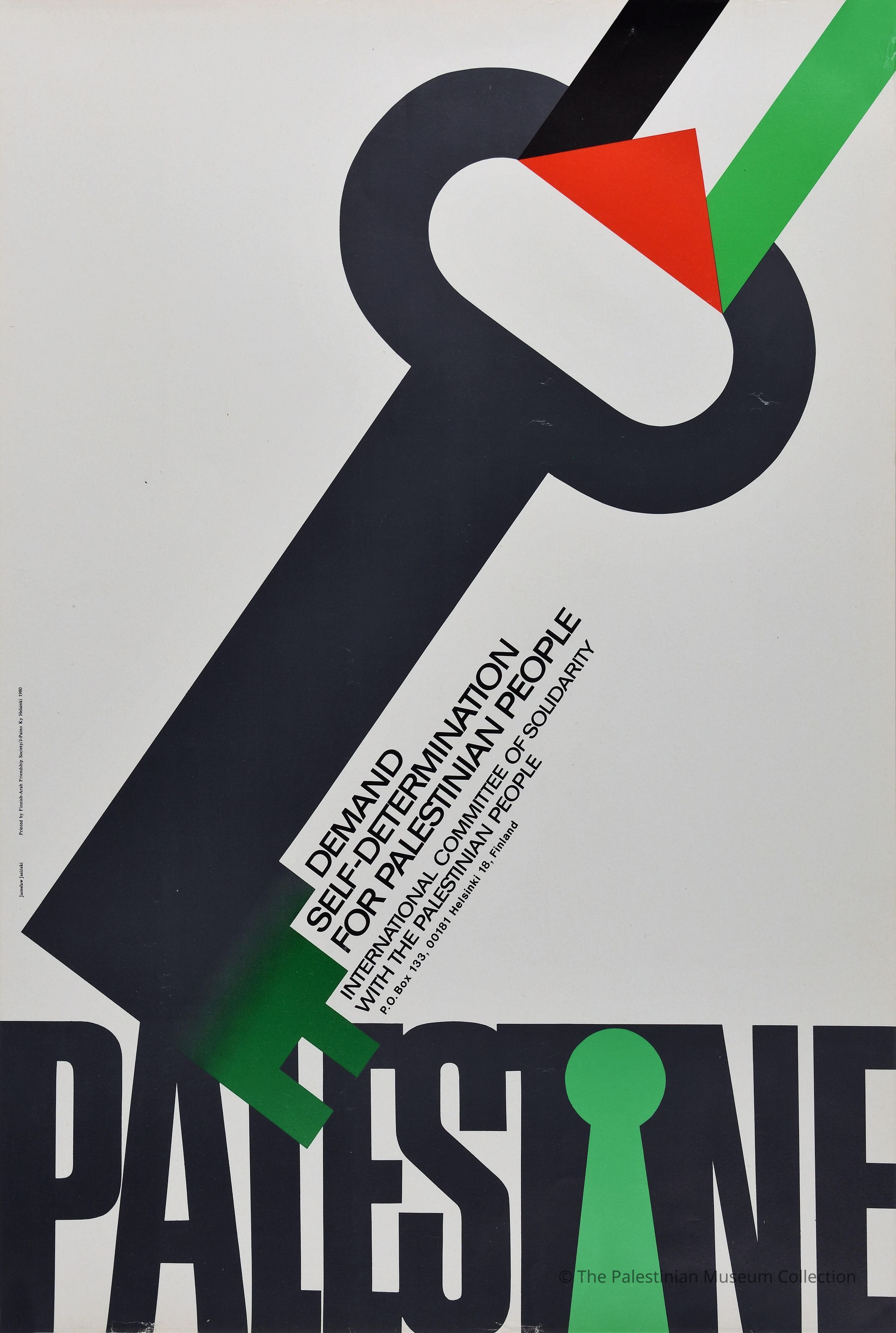 A colour poster showing the key of an old house; attached to the word "Palestine". The "i" in Palestine is replaced with the shape of a key.