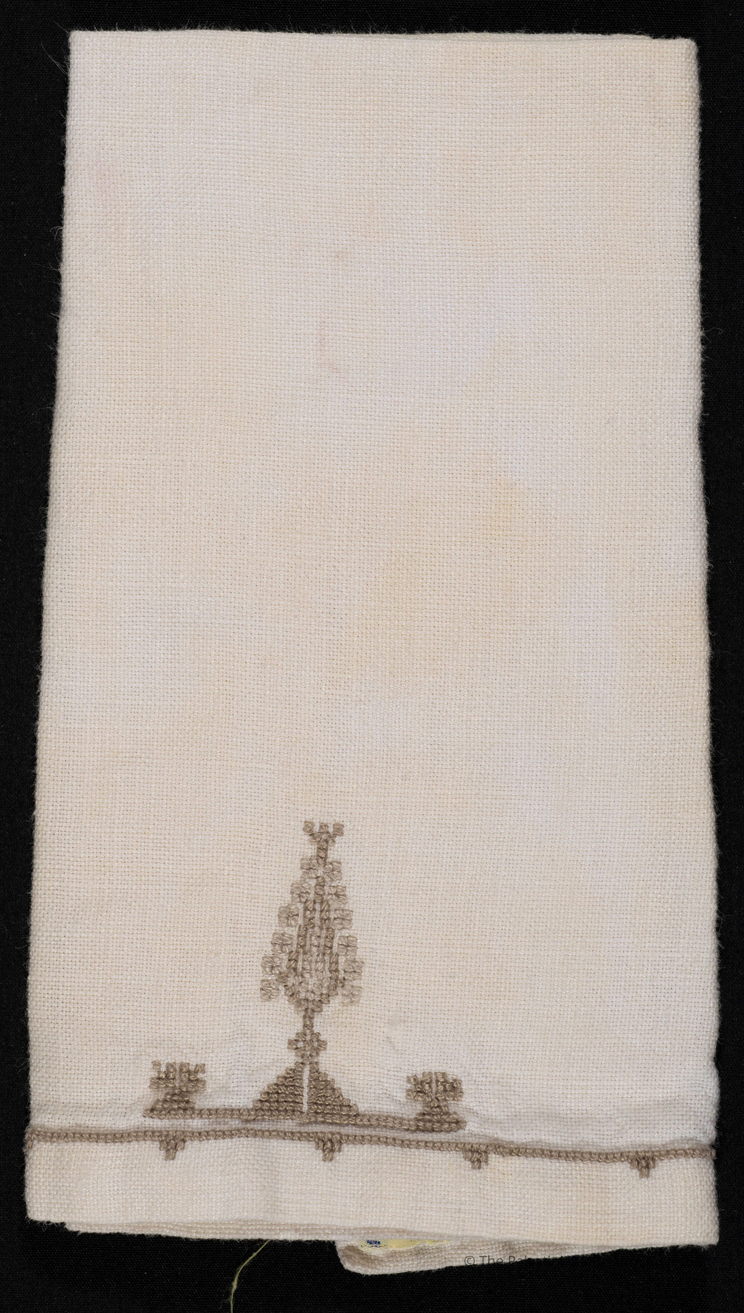 A table napkin made of beige linen. It has an embroidery in the shape of a cypress using the Fallahi (peasant) cross stitch. It was produced by the Arab Refugees Handicrafts Center in Jerusalem, owned by Asia Jeries Halabi.