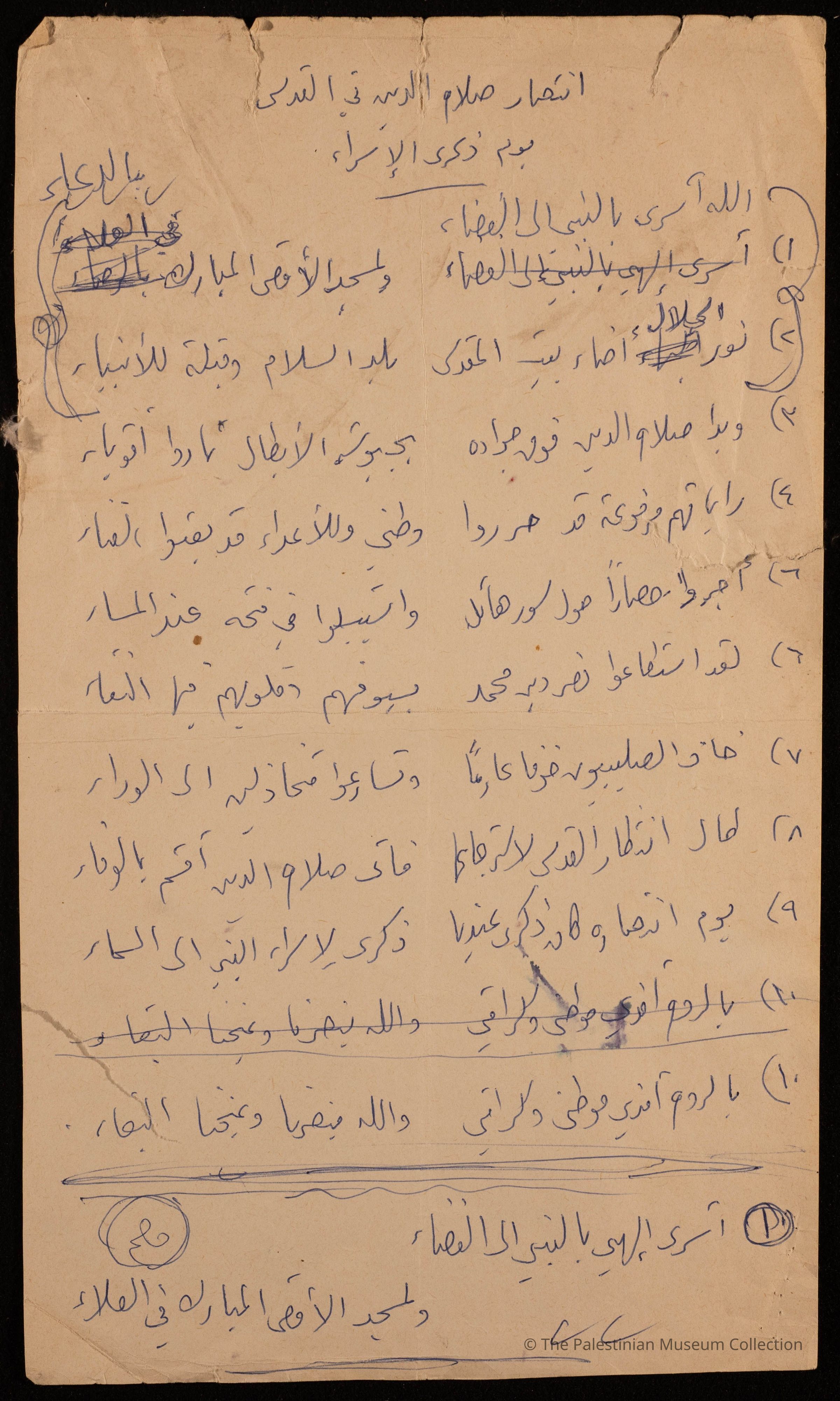 مخطوطة قصيدة باللغة العربية بعنوان"انتصار صلاح الدين في القدس يوم ذكرى الاسراء" للشاعرة فاطمة المحب ،ولا تحمل الوثيقة أية اشارات الى تاريخ كتابتها.