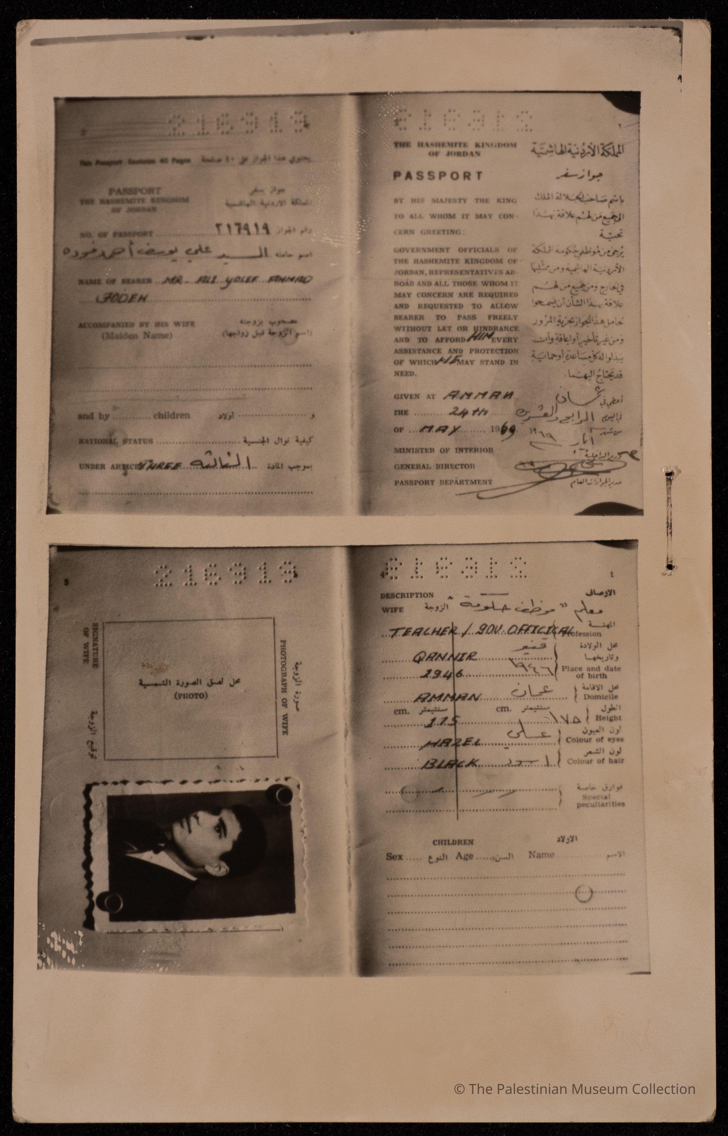 صورة غير ملونة عن جواز سفر علي فودة مكونة من بطاقتين. في البطاقة الاولى يوجد صورة عن أول أربع صفحات من الجواز والتي تحمل معلومات شخصية عن علي فودة وصورته الشخصية. أما البطاقة الثانية فهي عبارة عن صفحة واحدة تحمل معلومات عن جواز السفر.