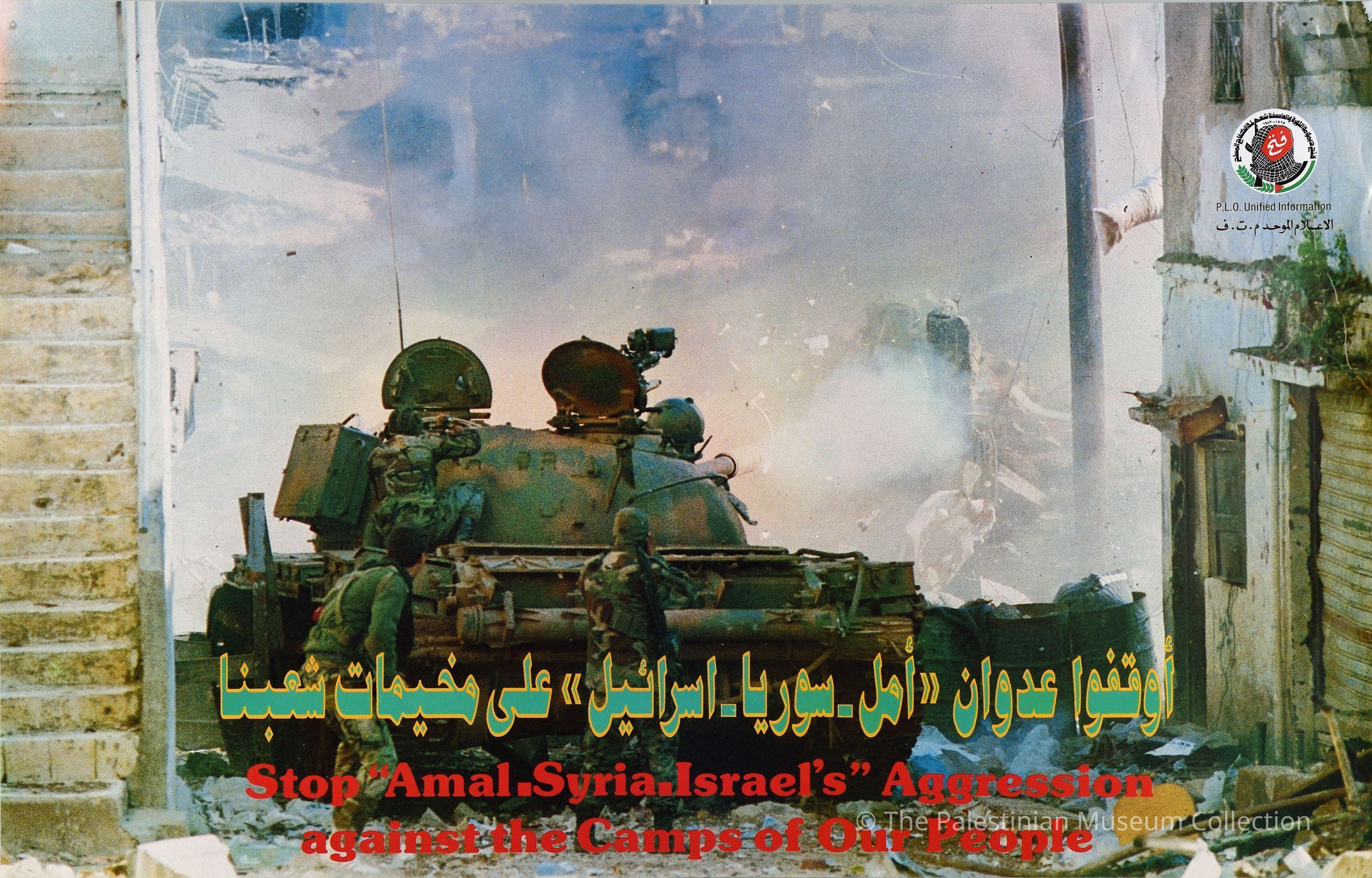 A colour poster showing a photograph featuring a glimpse of the Israeli attack on Amal Syria (The Hope of Syria) Refugee Camp in Lebanon. The photo shows a tank along with Israeli soldiers demolishing a house in front of them.Dimensions