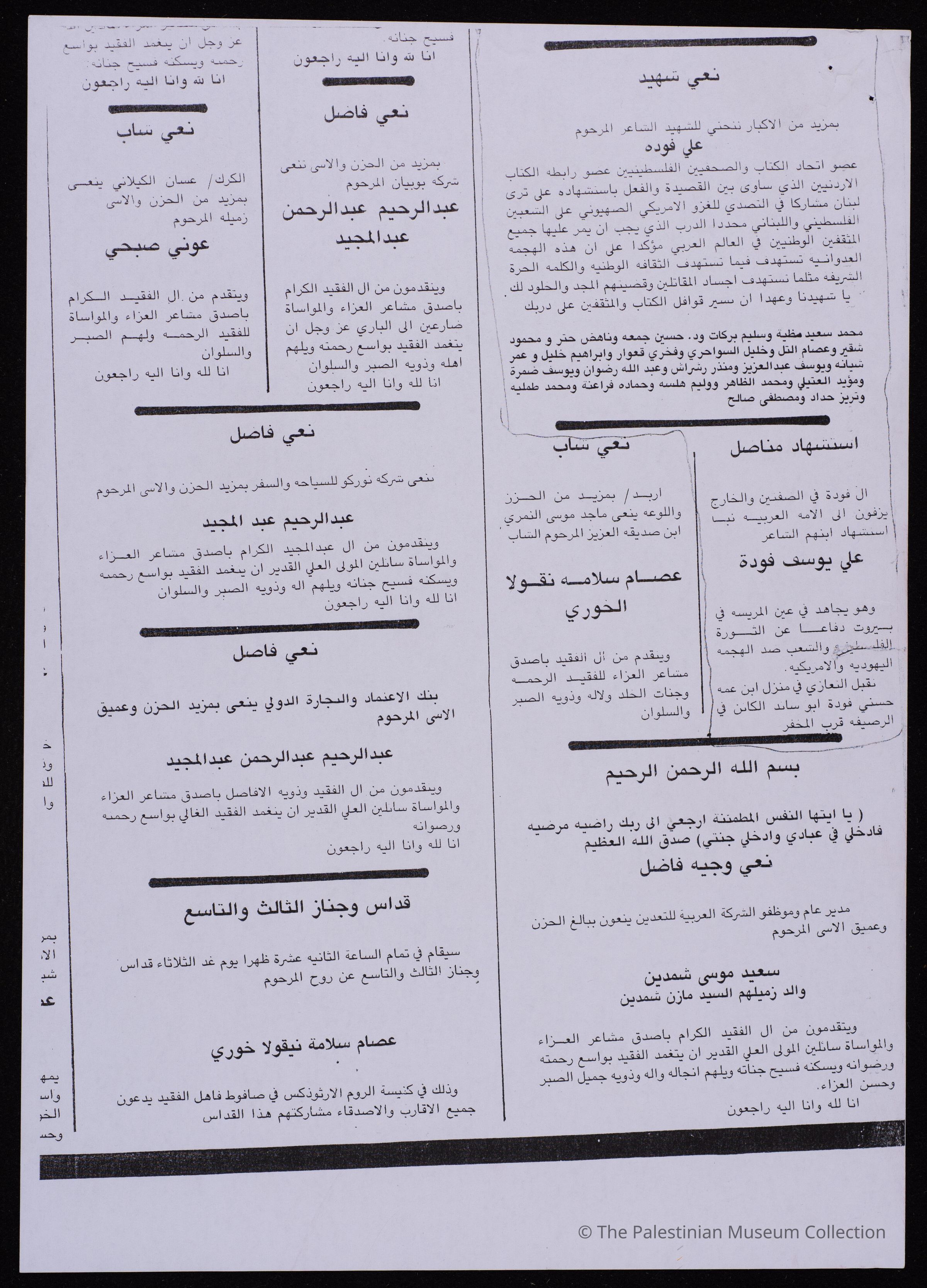 A copy of a newspaper clipping of an obituary for the martyr Ali Foda, along with obituaries for other people.