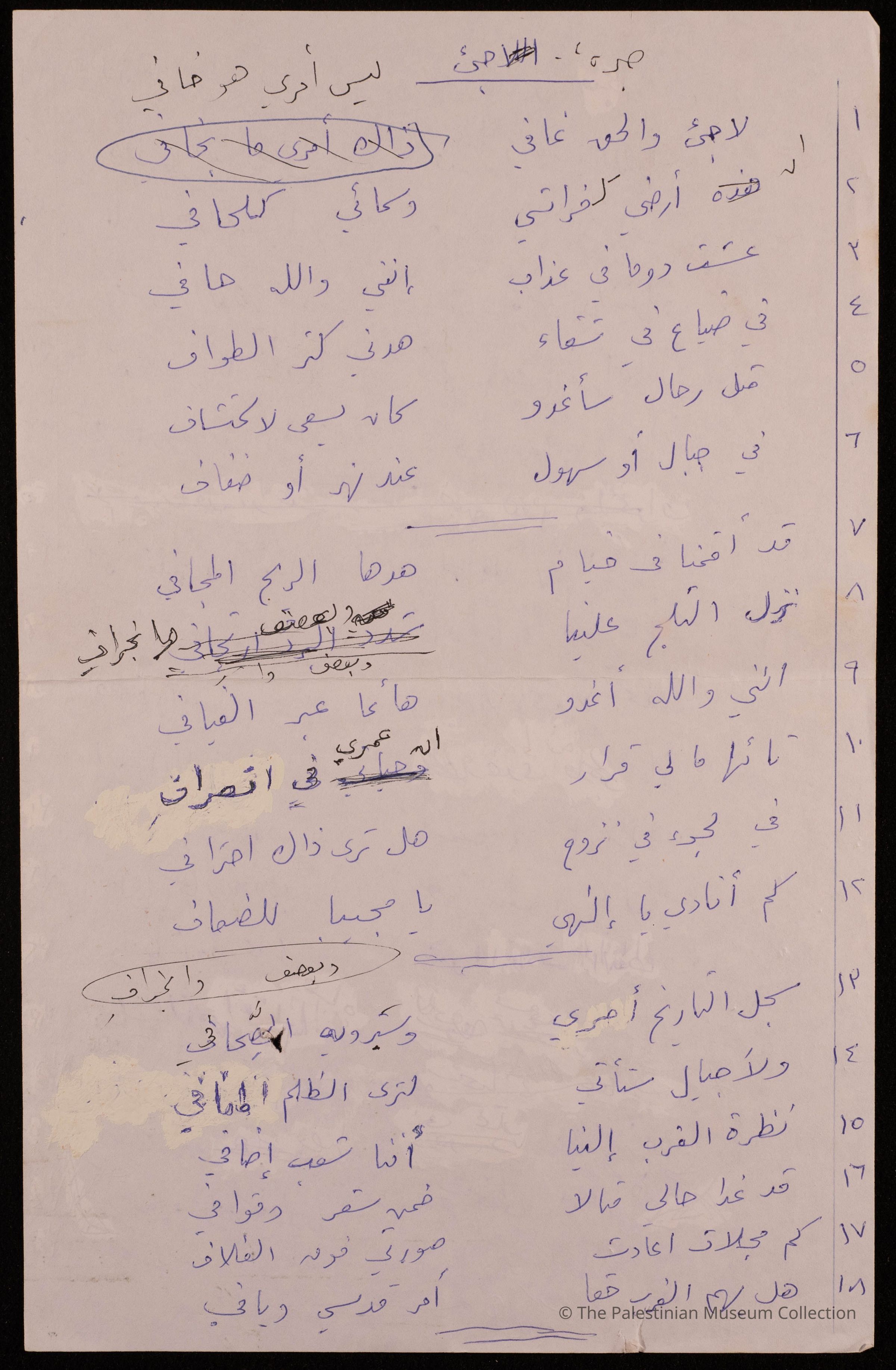 مخطوطة قصيدة باللغة العربية بعنوان " اللاجئ" للشاعرة فاطمة المحب، ولا تحمل الوثيقة اية اشارة الى تاريخ كتابتها.
