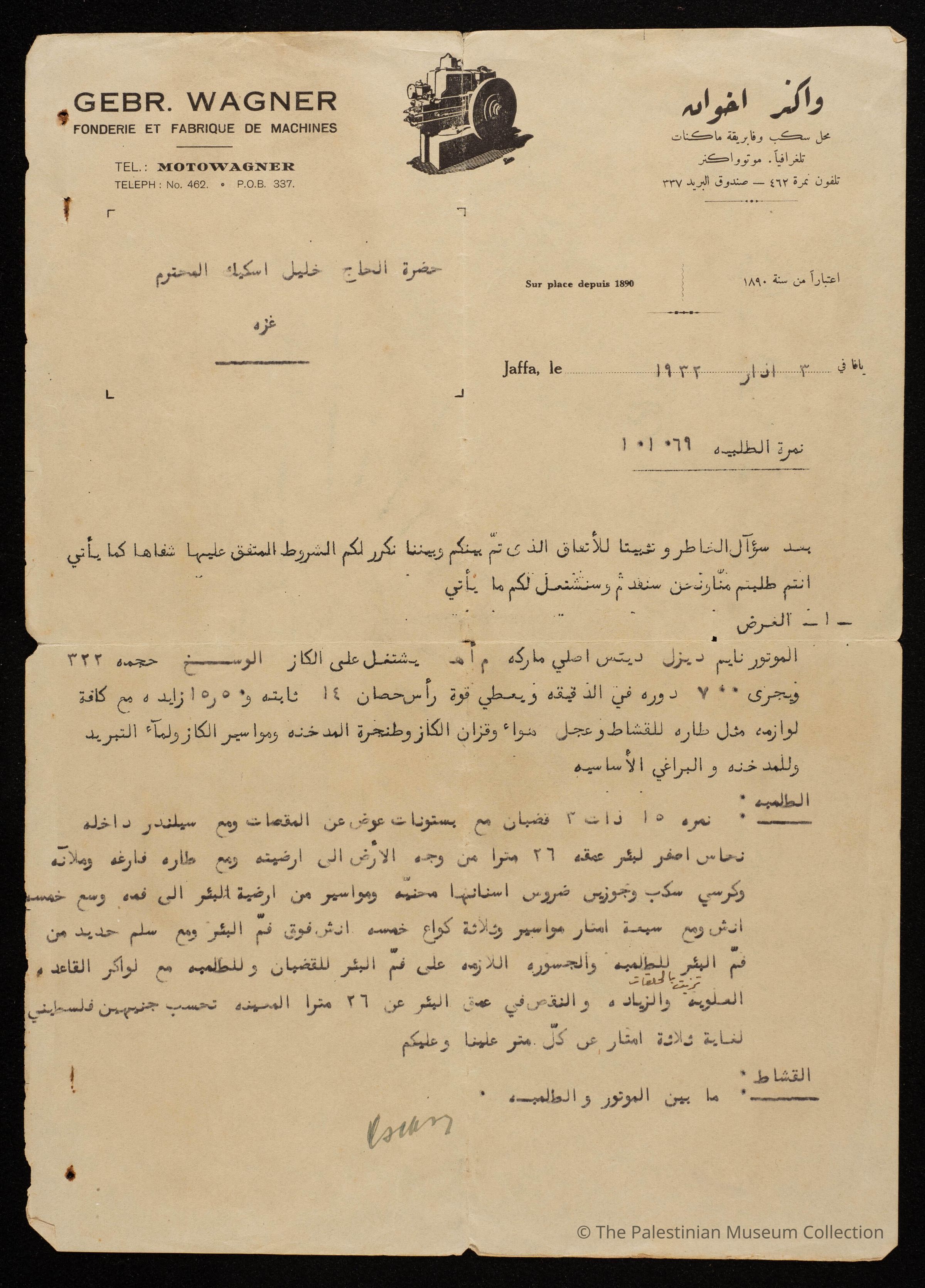 وثيقة تحتوي على اتفاق بين الحاج خليل اسكيك وشركة واكنر اخوان بخصوص طلبية شراء مواد خاصة بالبئر. كُتبت الوثيقة باللغة العربية والانجليزية
