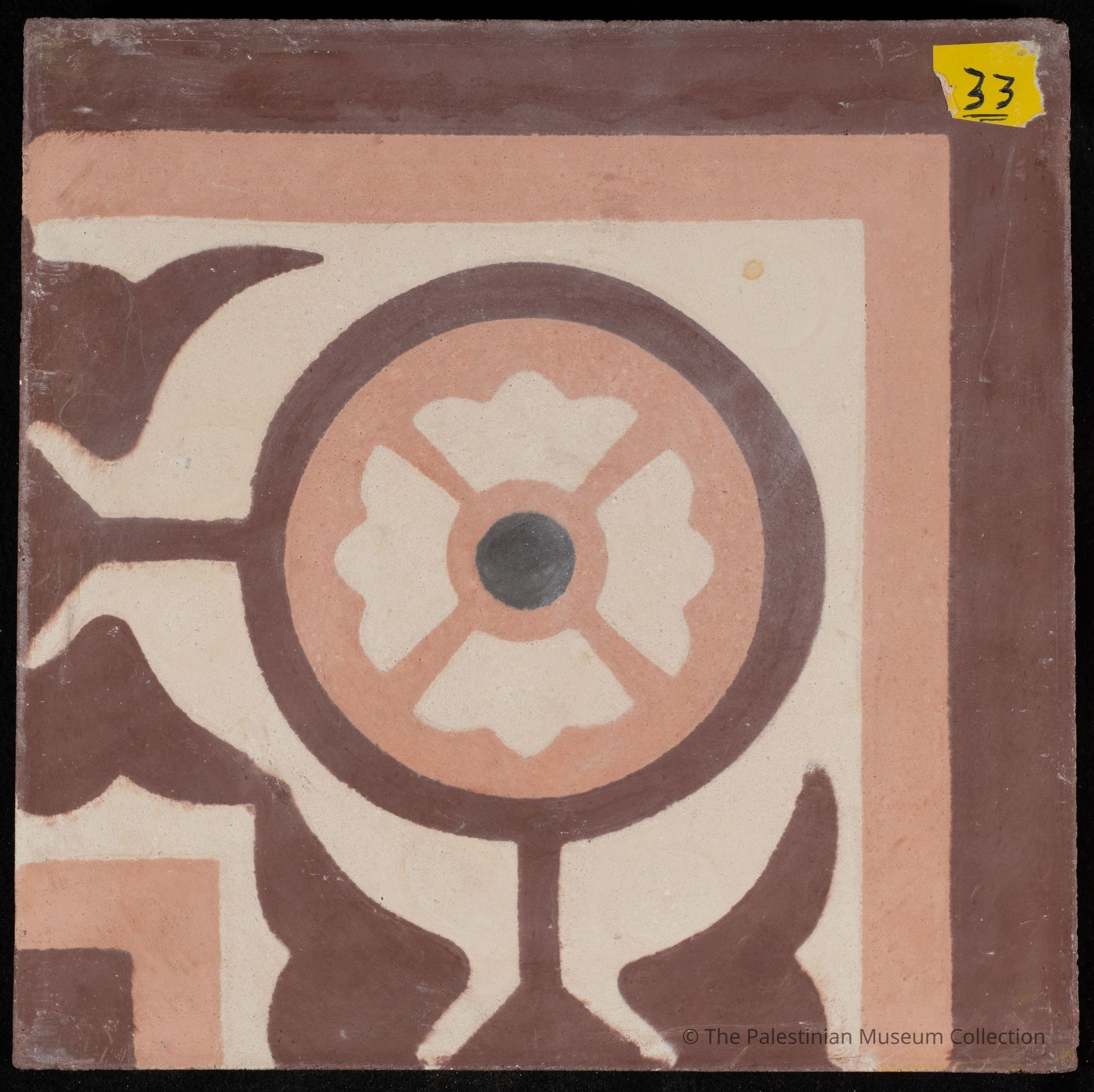 بلاطة زاوية زنار إسمنتيّة ملوّنة بحجم 20 × 20 سم، وهي نموذج حديث سُكبت في قالب يمتلكه مصنع أصلان للبلاط في نابلس.