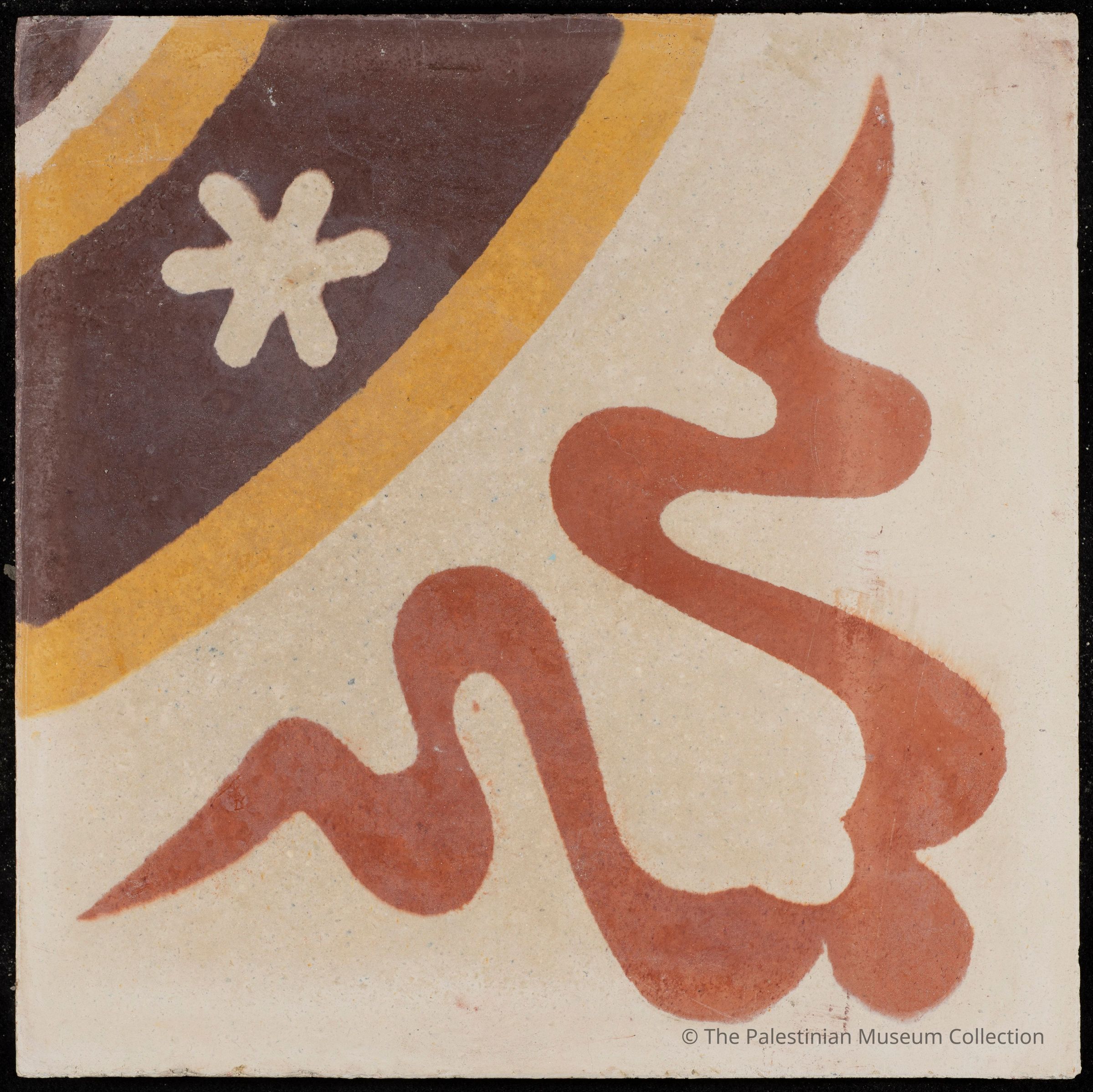 A 20 × 20 cm coloured cement tile featuring the "Corner of the Round Zunnar (Border)" design. This tile is a contemporary reproduction, cast using an original mold from the Aslan Tile Factory in Nablus.Made/Created