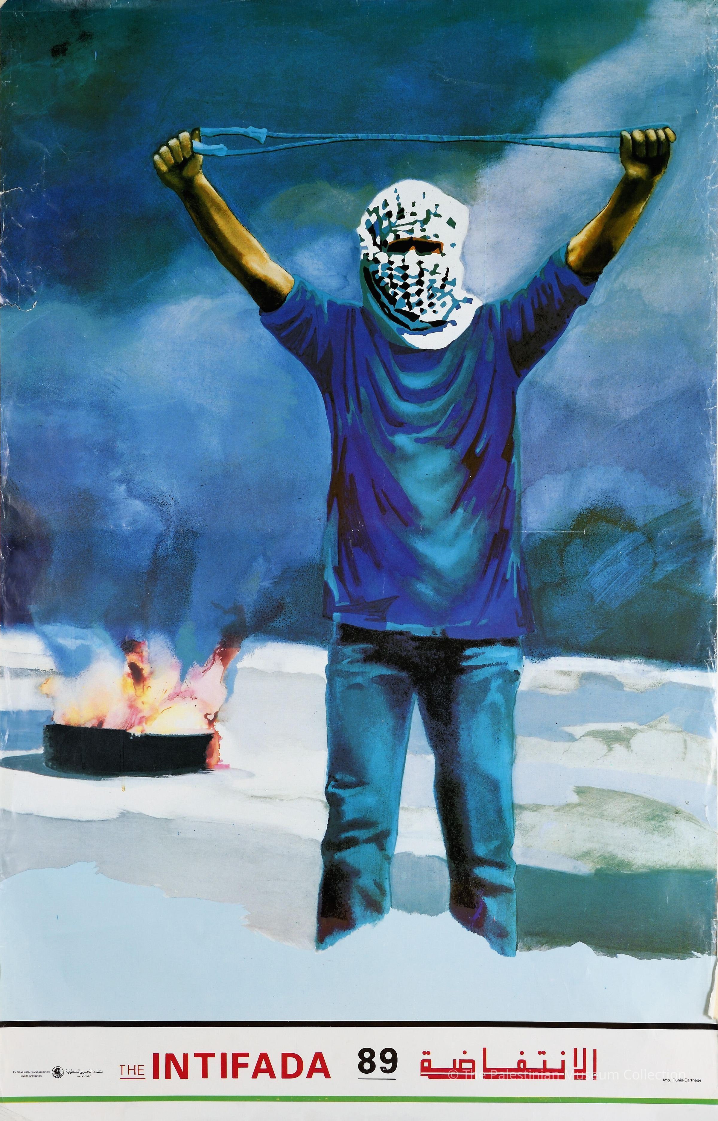 A colour poster showing a masked Palestinian holding a slingshot with a burned car wheel in the back.Dimensions