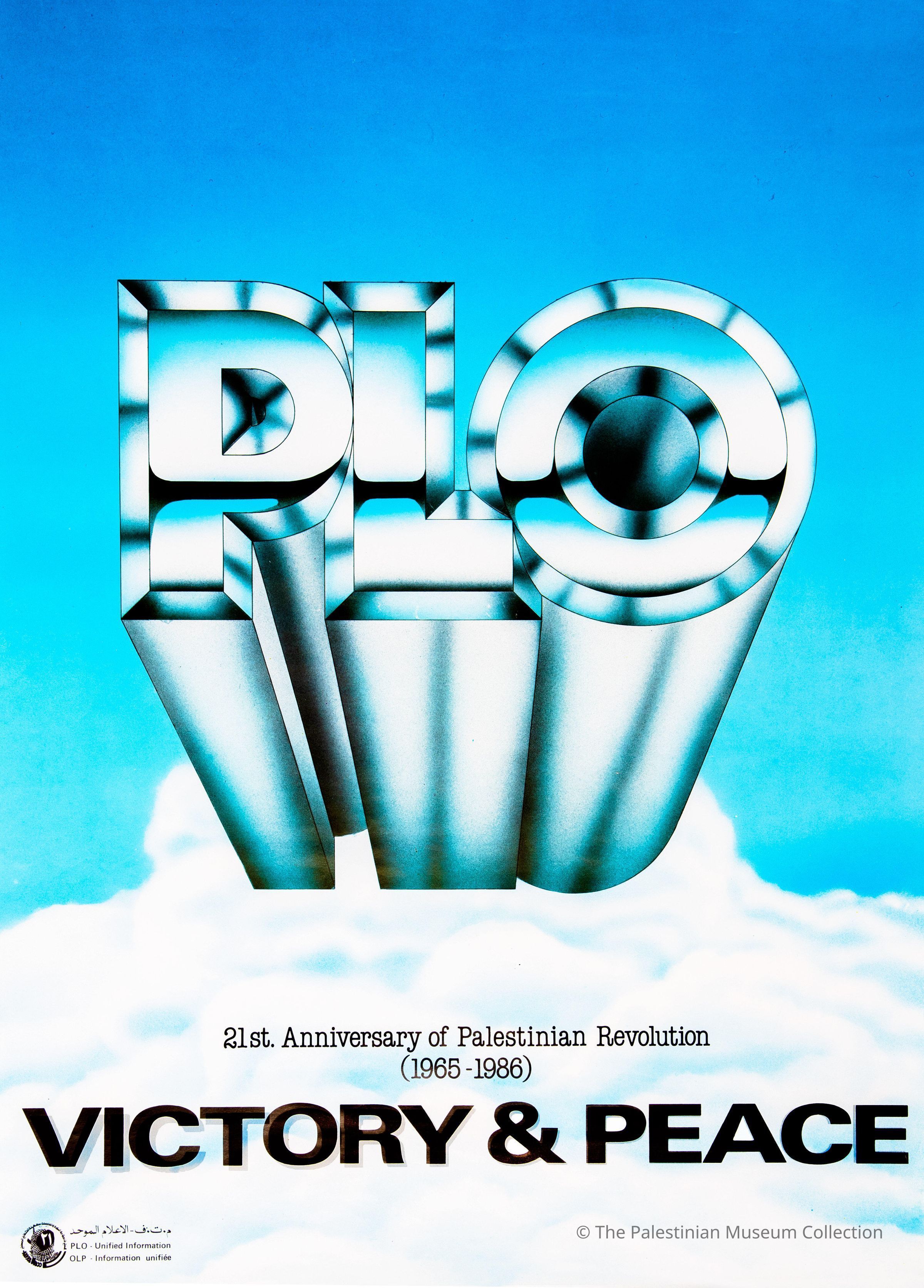 A poster entitled 'Victory & Peace' issued by the Unified Information Office of the Palestine Liberation Organisation (PLO) in 1986 to commemorate the 21st anniversary of the founding of the Palestinian National Liberation Movement (Fatah). The Museum collection has one duplicate available of this poster.