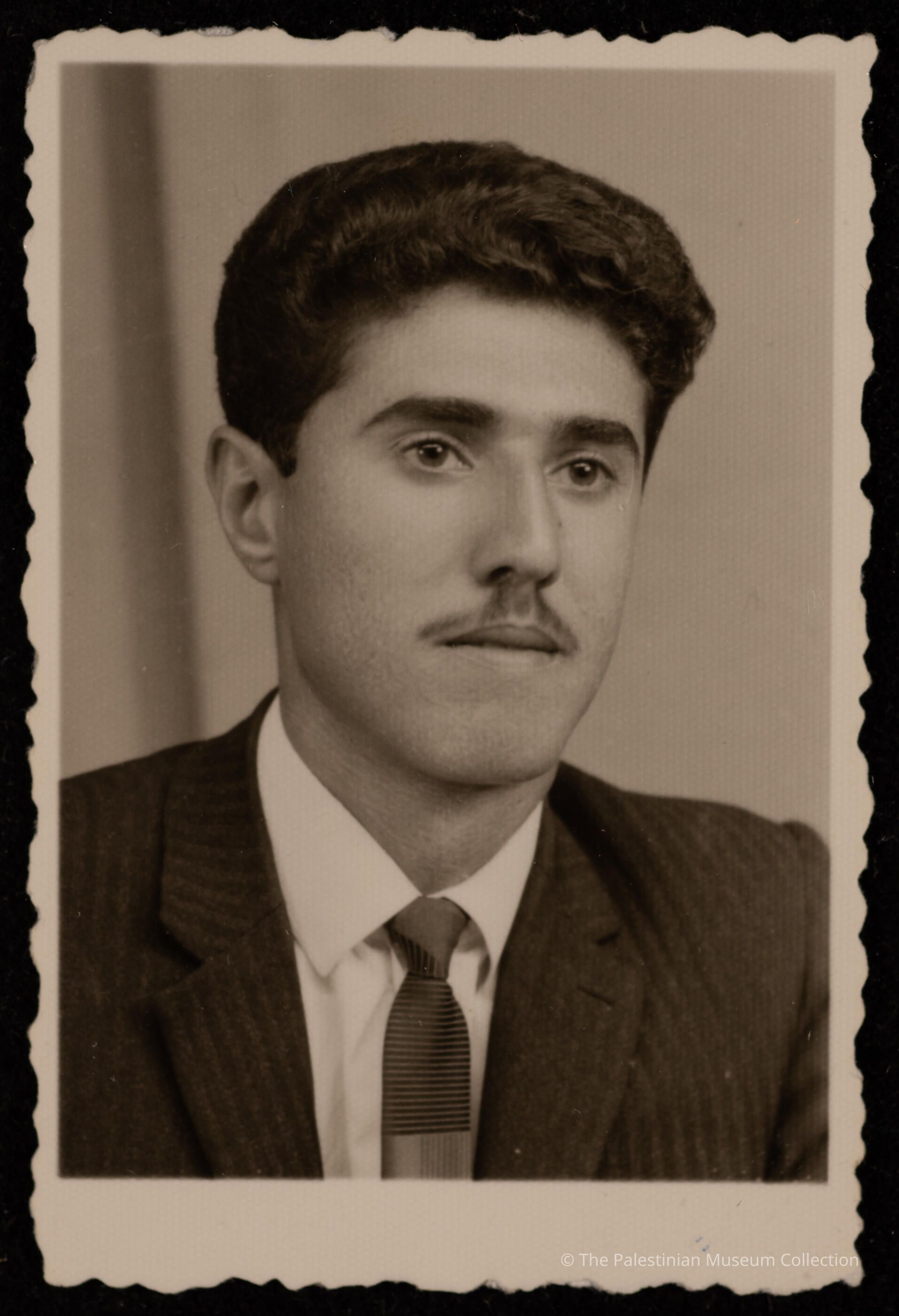 صورة غير ملونة، عبارة عن صورة شخصية لعدنان، يرتدي فيها ملابس رسمية وربطة عنق.