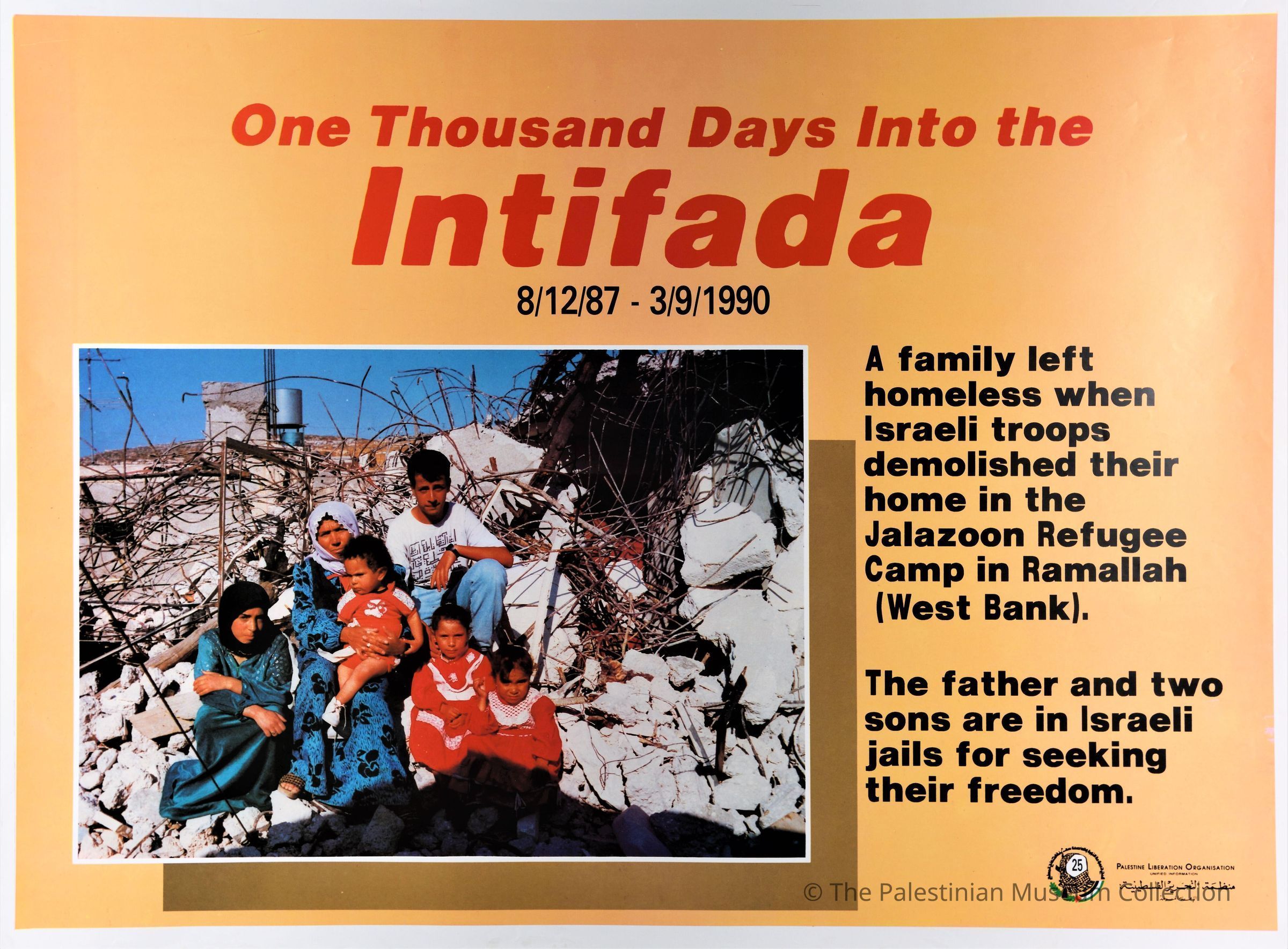 ملصق ملون، عبارة عن صورة لعائلة تجلس على ركام منزلها الذي تم تدميره من قبل الاحتلال الاسرائيلي، وسجن الأب وولدين من العائلة.