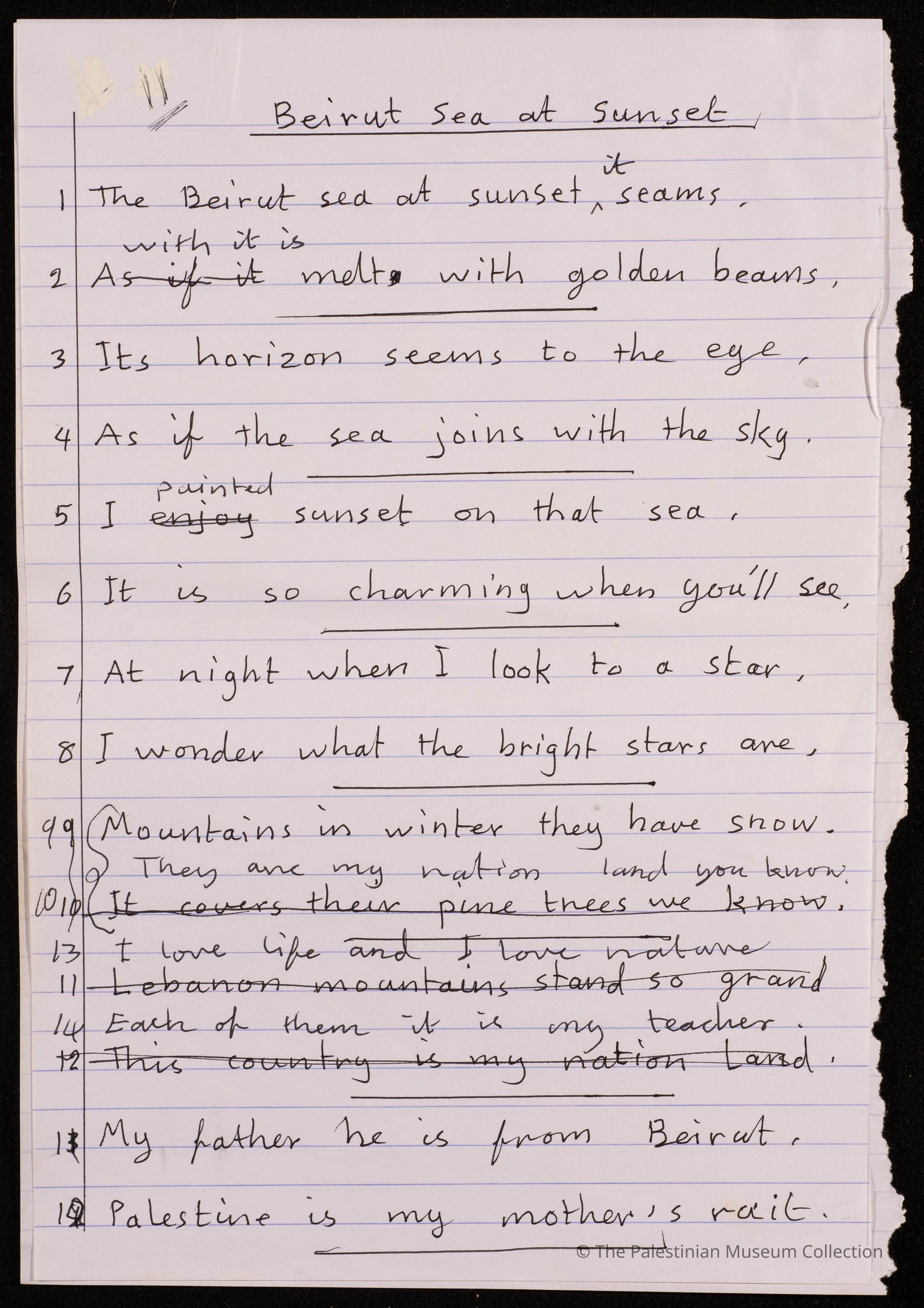 مخطوطة قصيدة باللغة الانجليزية بعنوان" بحر بيروت عند الغروب Beirut Sea at Sunset" للشاعرة فاطمة المحب، ولا تحمل القصيدة اية اشارة الى تاريخ كتابتها .