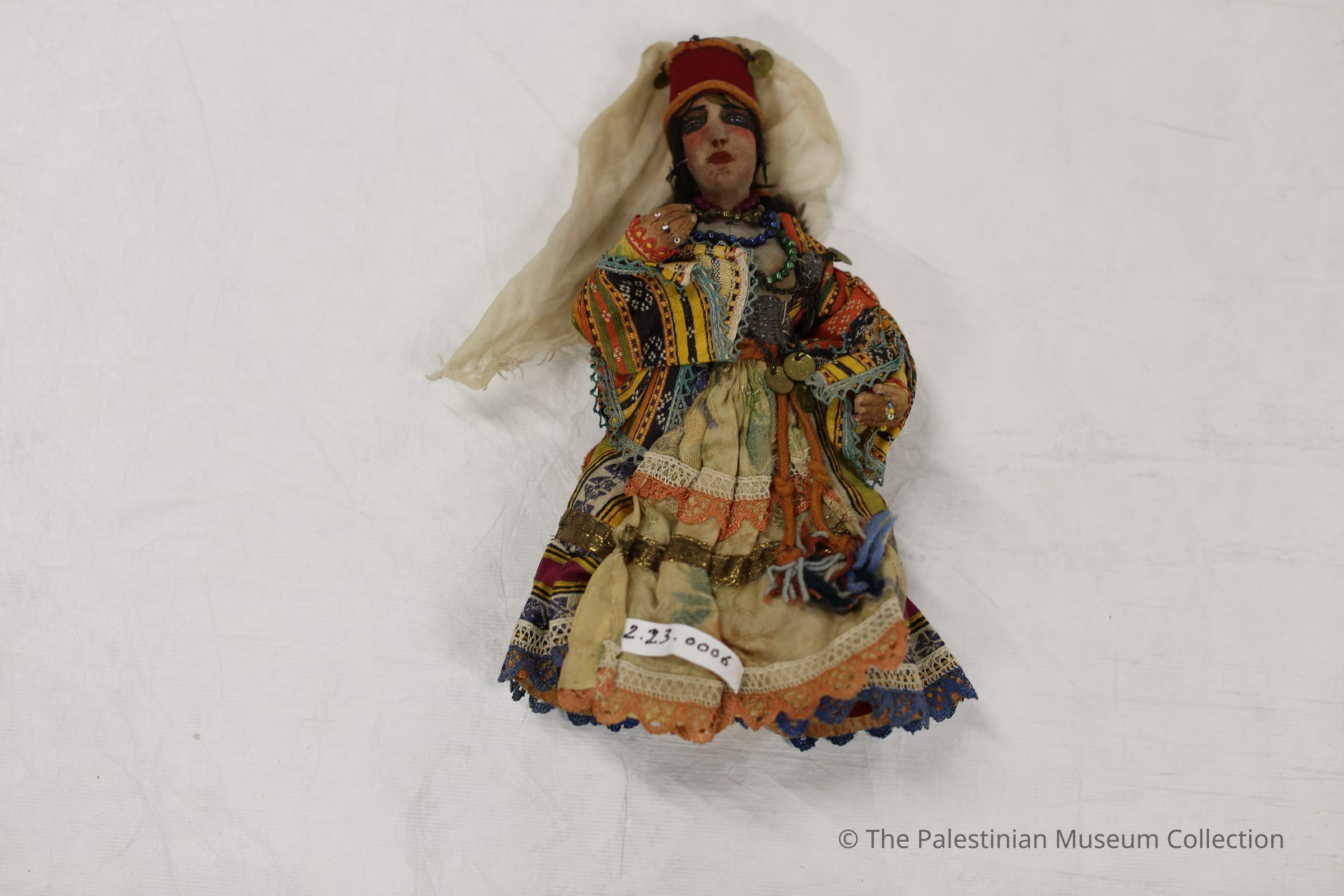 دمية على شكل امرأة ذات بشرة سمراء وشعر اسود طويل (ثلاثة جدايل مصنوعة من الشعر والقماش البرتقالي) ترتدي ملابس تراثية وهي كالتالي:
