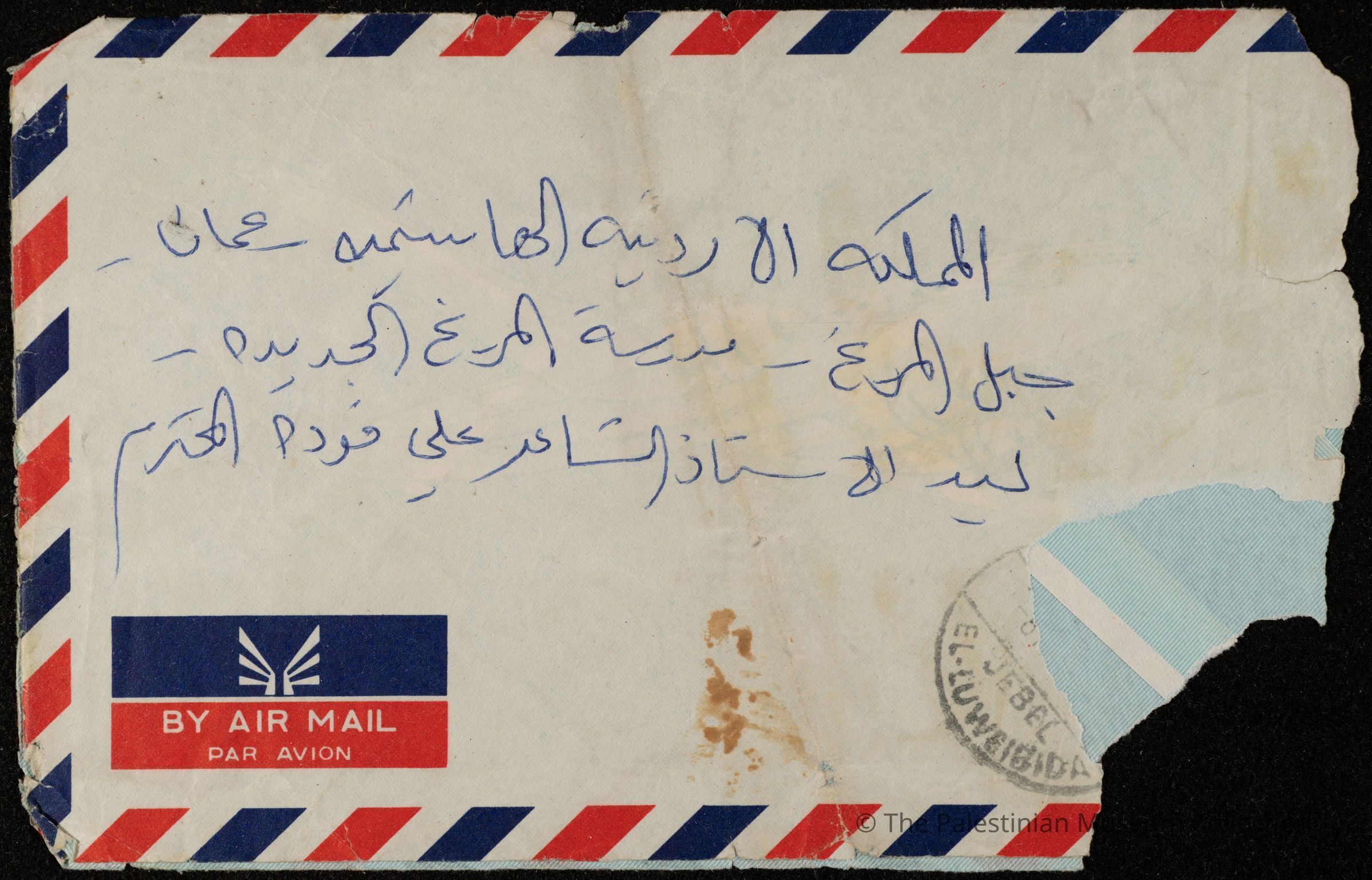 رسالة من ملاك الرملاوي الى السيد علي فودة، تحتوي على طلب ارسال قصيدة "عاد عاد" وعنوان بريد الانسة ملاك.