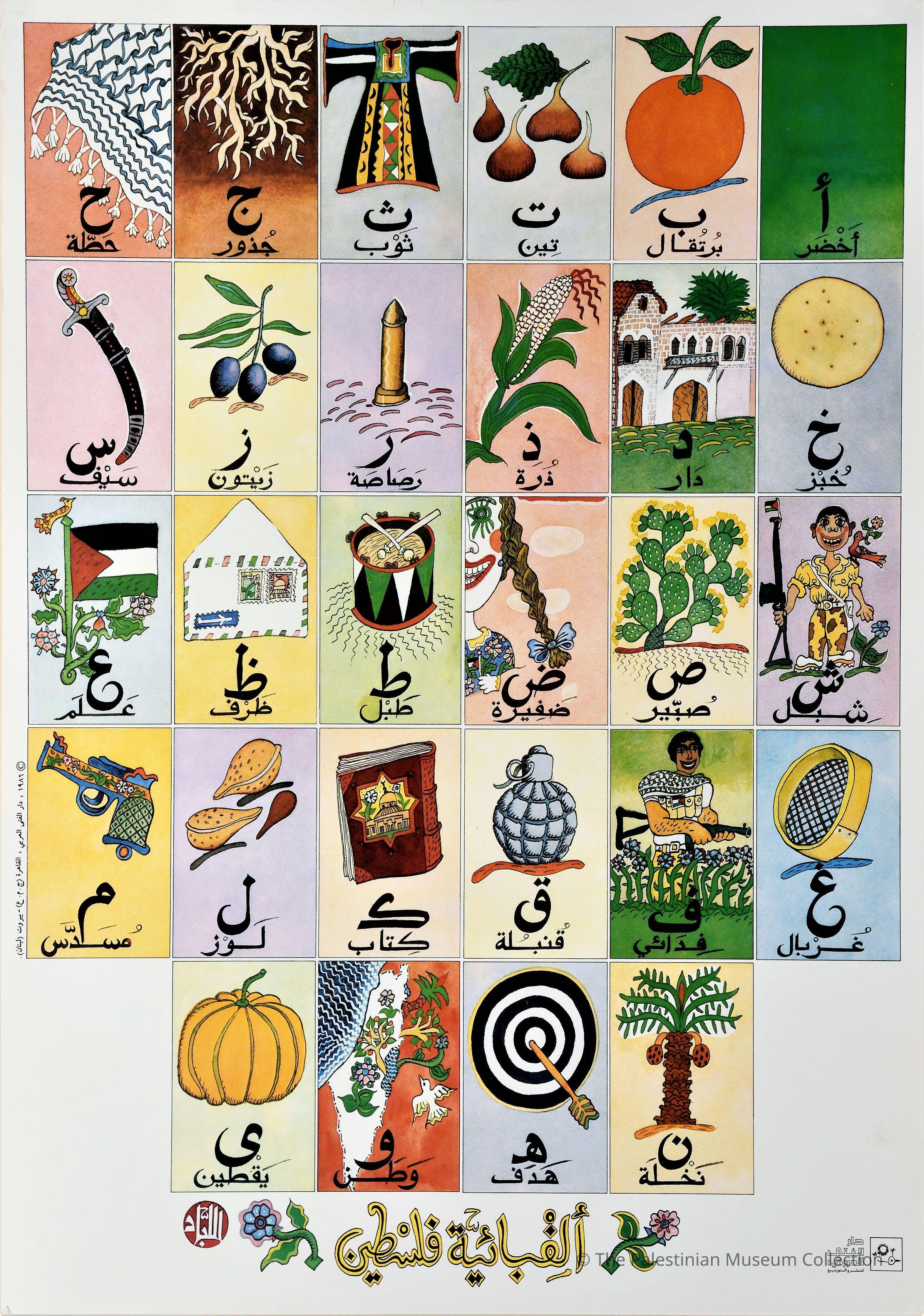ملصق ملون، عبارة عن الألفبائية العربية، يظهر فيها الحروف العربية ، أسفل كل حرف يوجد مثال عليه يمثل الواقع الفلسطيني؛ لذلك سميت "ألفبائية فلسطين".