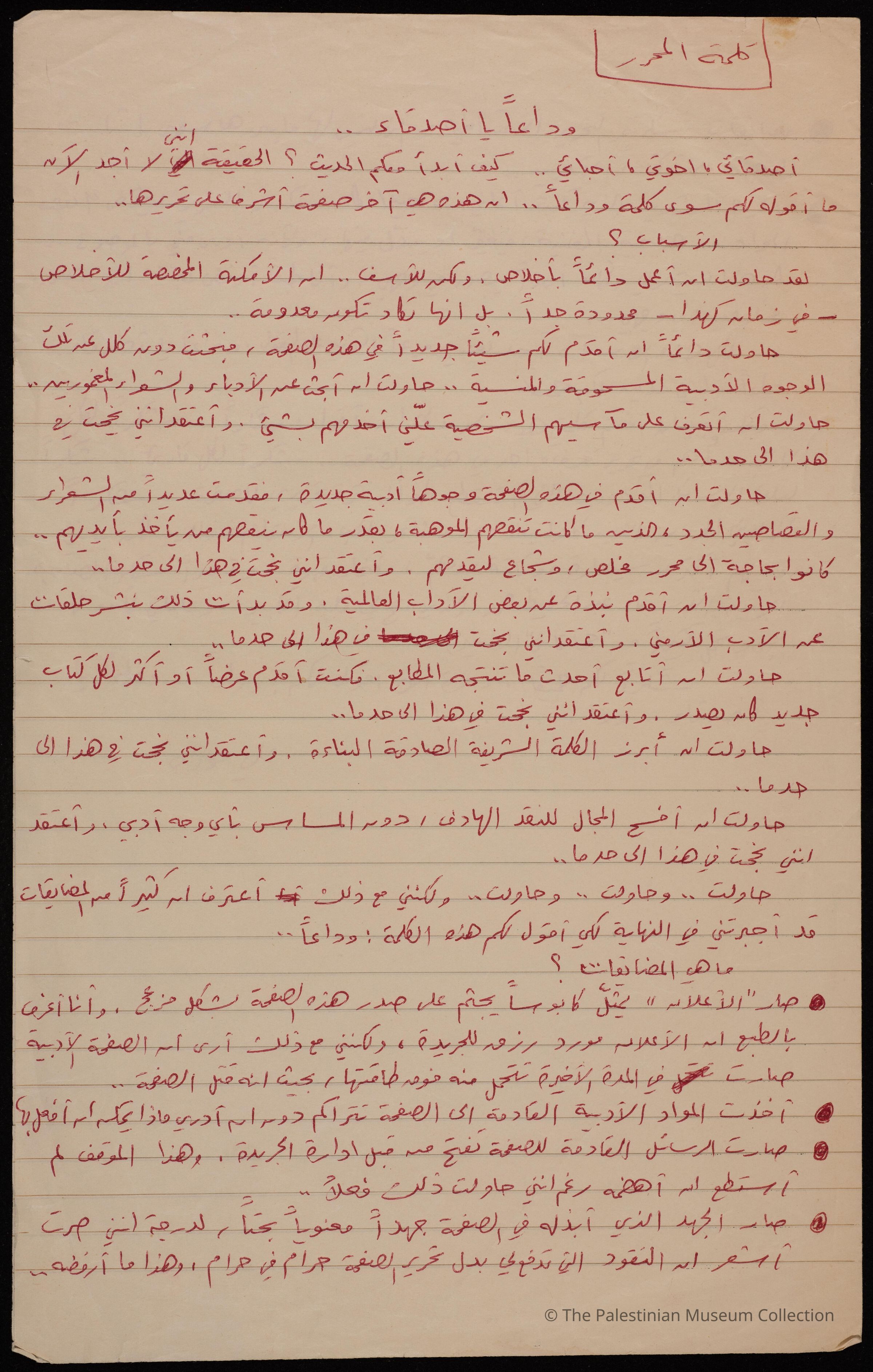كلمة المحرر وداعا يا أصدقائي، تحتوي على صفحتين من كلمات الشاعر علي فودة يودع فيها اصدقائه، كتبت بخط يد الشاعر علي فودة.