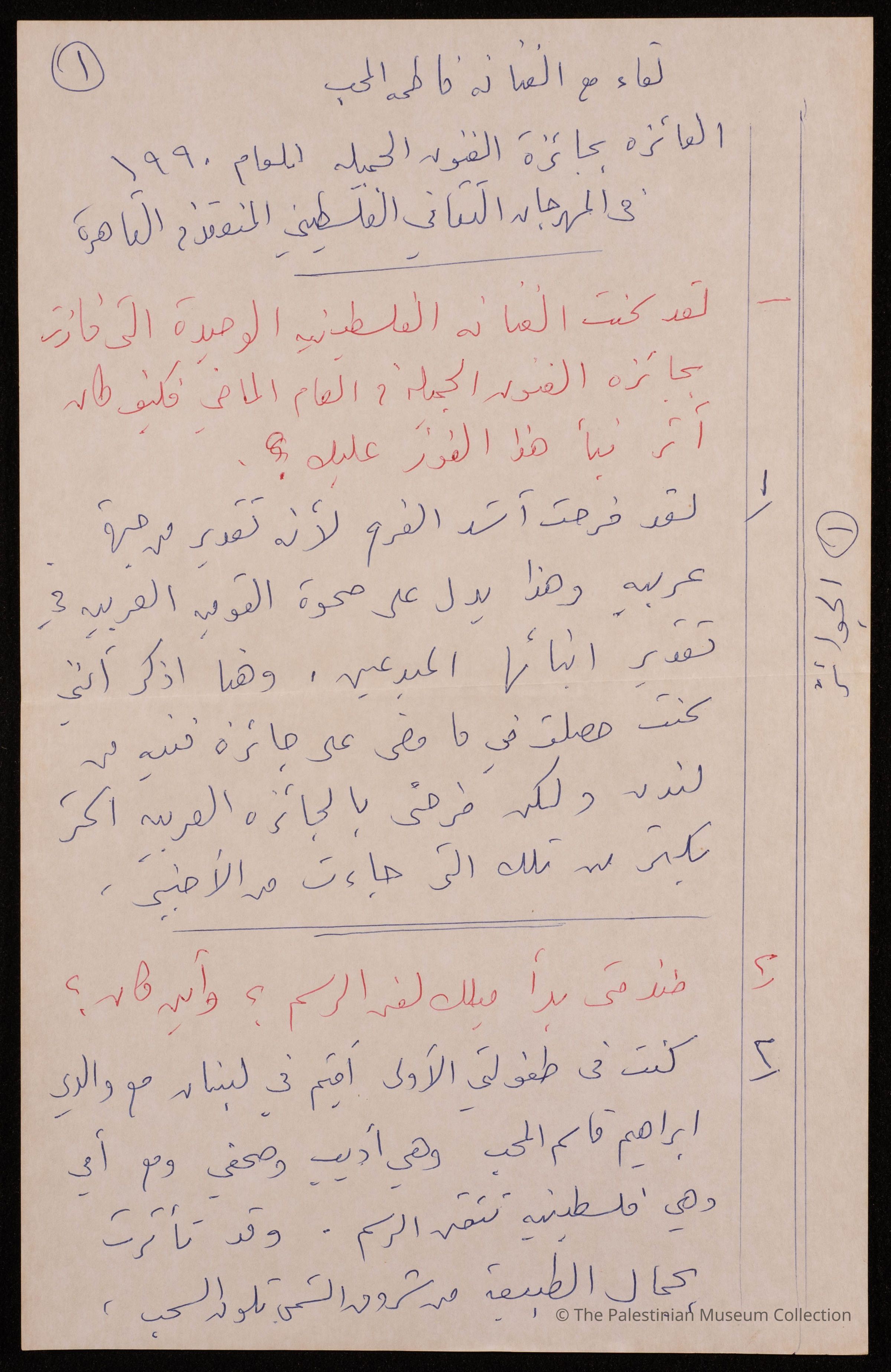 مخطوطة مقابلة صحفية باللغة العربية بعنوان" لقائ مع الفنانة فاطمة المحب الفائزة بجائزة الفنون الجميلة للعام1990 في المهرجان الثقافي الفلسطيني المنعقد في القاهرة" مكون من 9 صفحات، ولا تحمل الوثائق اية اشارة الى تاريخ كتابتها .