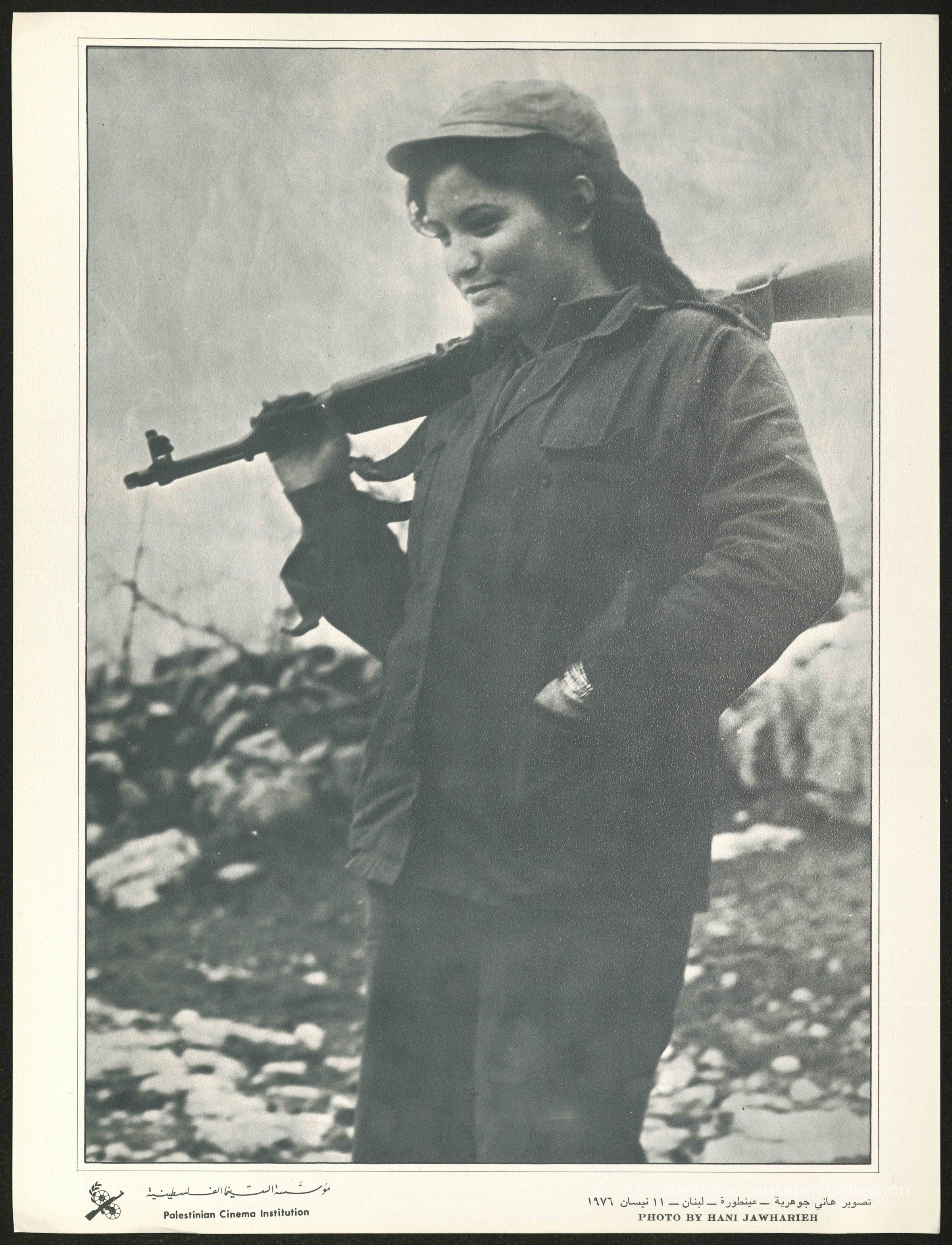 Taken by photographer Hani Jawharieh in 1976, this black-and-white photograph shows a woman wearing a military unifrom and carrying a shotgun in Aintoura in Lebanon.