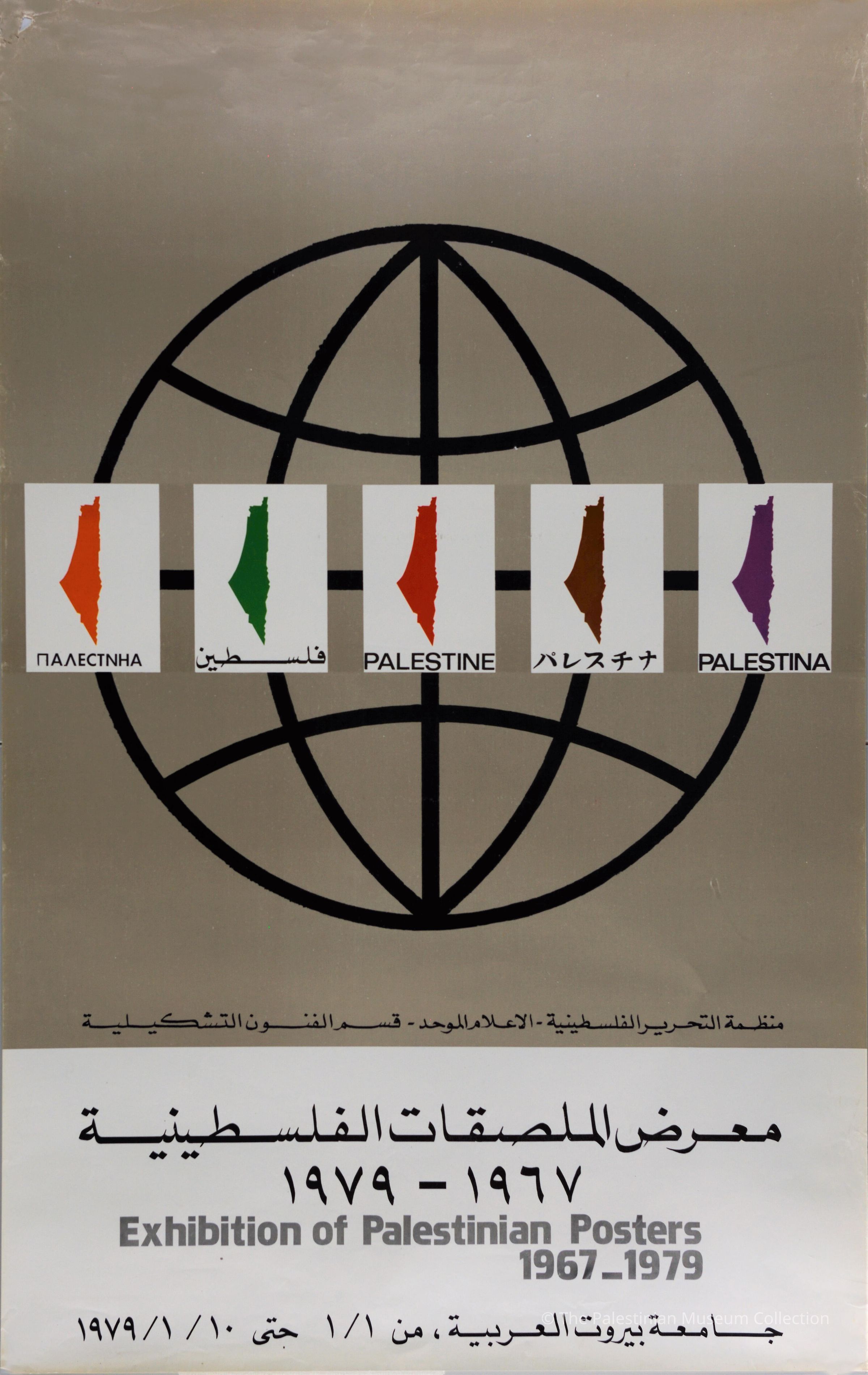 Published during the Exhibition of Palestinian Posters; which took place in Beirut Arab University in 1979, this colour poster shows drawings of the map of Palestine; written on which texts in many languages.Dimensions