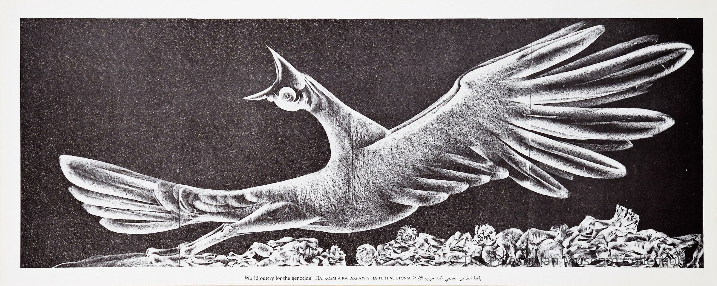 A black-and-white poster showing a painting of a bird screaming as it protects the martyrs on the ground