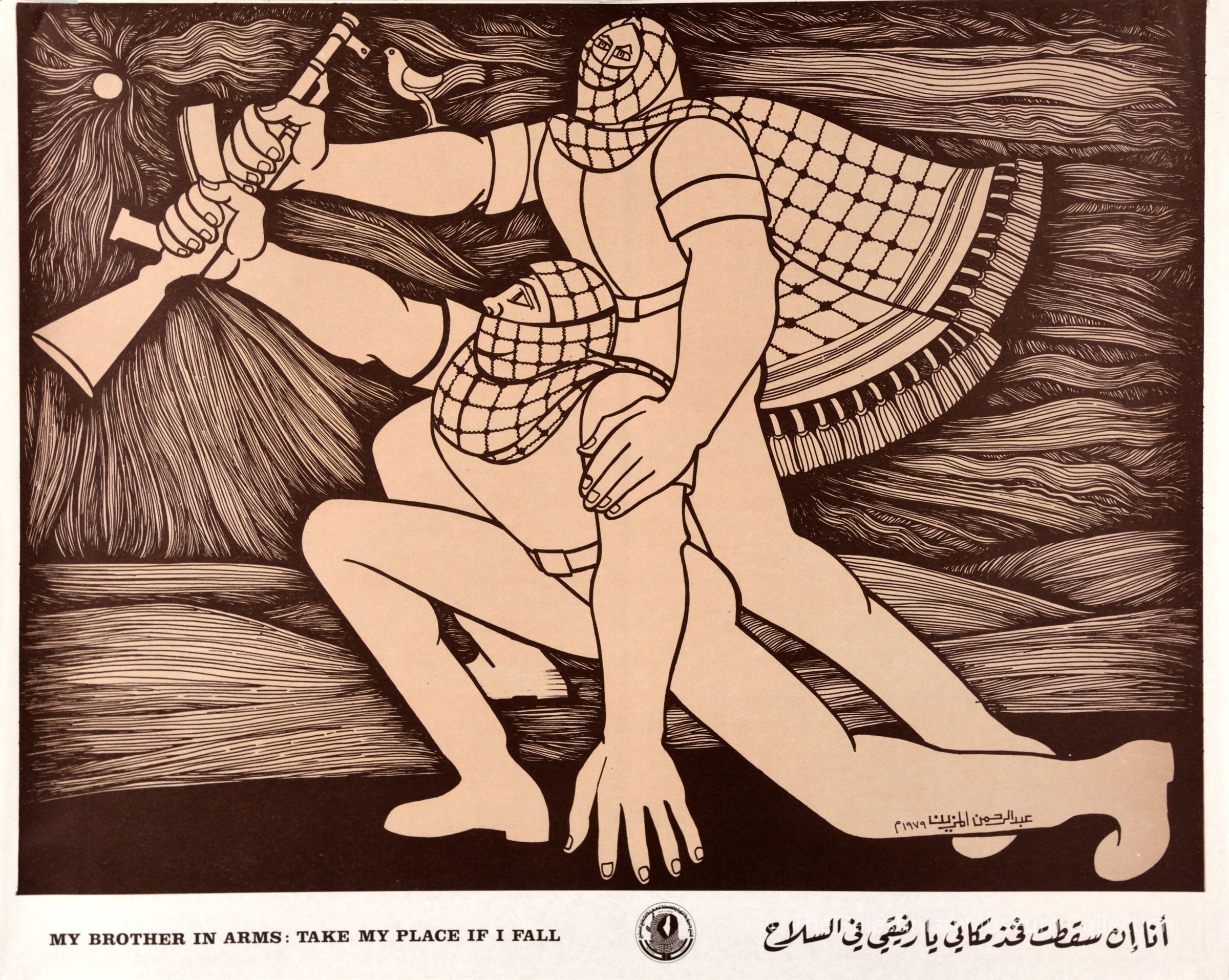 This poster entitled 'My Brother in Arms: Take My Place If I Fall' features artwork by the artist Abdelrahman Al Muzayen. It was issued in 1979 by the Palestinian National Liberation Movement-Fatah.Dimensions