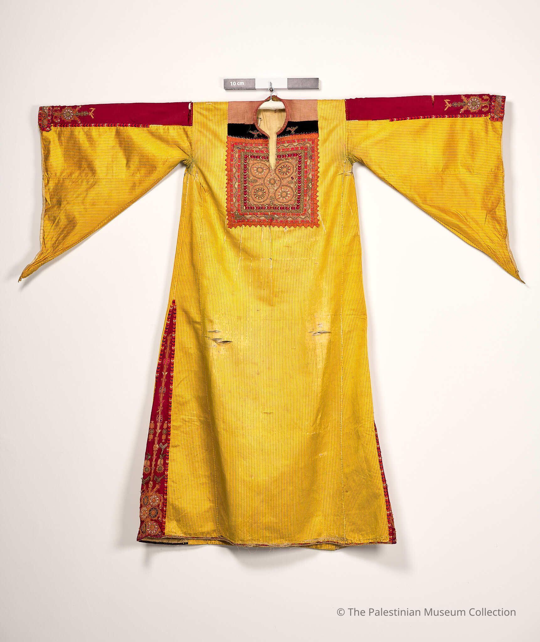 Abu Qutba (Asawiri) thobe (dress) from the area of Silwan, Jerusalem. It is made of yellow Ottoman cloth striped in black, embroidered with silk threads in orange, red and green, and gilded qasab (metallic couching cord) with a Tahriri stitch. The chest panel is embroidered with geometric and plant shapes like roses with a Tahriri stitch in red and orange silk threads. Moreover, part of the panel is made of a purple velvet fabric embroidered with bird motif, whereas the back of the chest panel (the upper back neckline) is made of pink linen. The sleeves are mradan (long triangular sleeves), with part made of burgundy heremzi, embroidered with Laff and Tahriri stitch in manajil (sickles) and watch motifs. The front panel of the thobe bears no tatreez, whereas the bottom of the back panel has a tatreez (embroidery) of watch motif. The sides (al-Banayiq) are made of burgundy heremzi silk and embroidered with stitch patterns of geometric and plant shapes along with manajil motifs with a Tahriri (couching) stitch.Made/Created