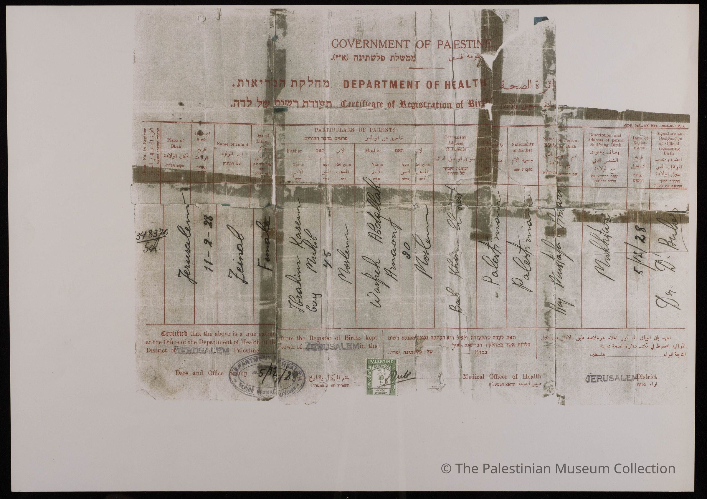 A copy of Zainab Al-Muhib birth certificate issued by the Department of Health in Palestine on November 5, 1928. The certificate includes her personal information.