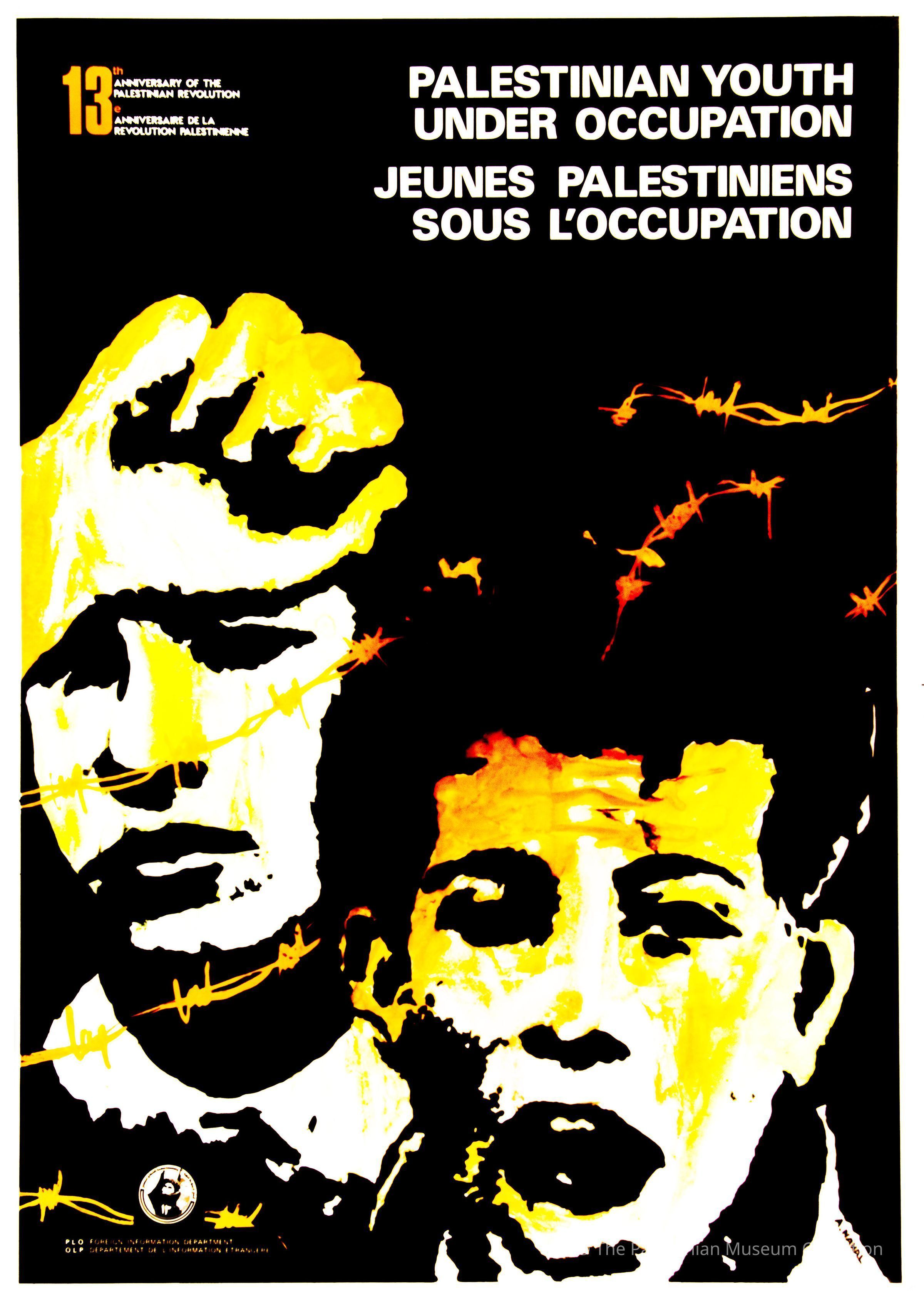 A poster entitled 'Palestinian Youth Under Occupation' issued by the Unified Information Office of the Palestine Liberation Organisation (PLO) in 1978. It was designed by the artist Ahmed Al Nahal.Dimensions