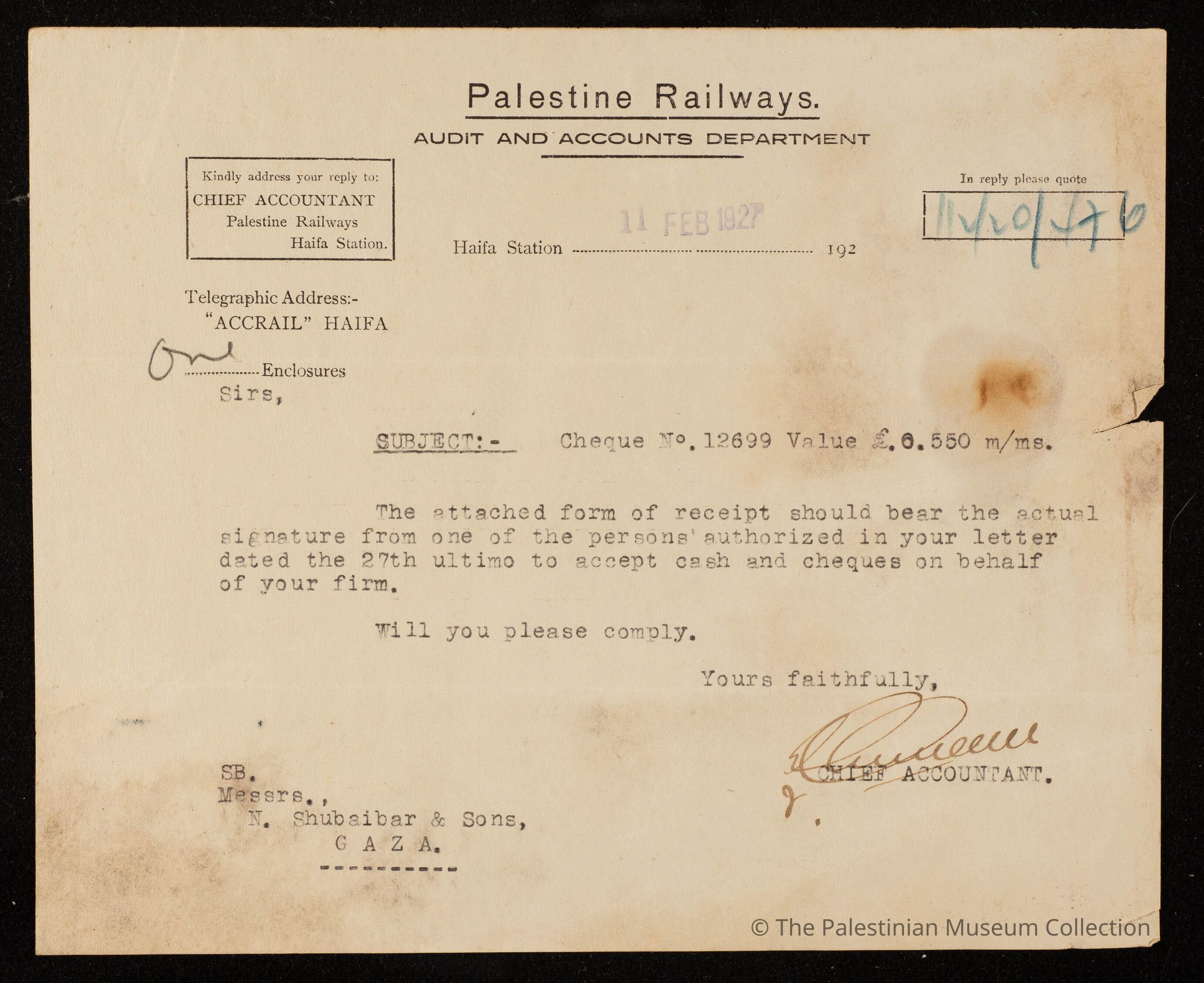 وثيقة رسمية صادرة عن دائرة التدقيق والحسابات في سكك حديد فلسطين من محطة حيفا. وهي عبارة عن رسالة موجهة إلى شركة شحيبر وأولاده في غزة بخصوص شيك. كُتبت الوثيقة باللغة الانجليزية.