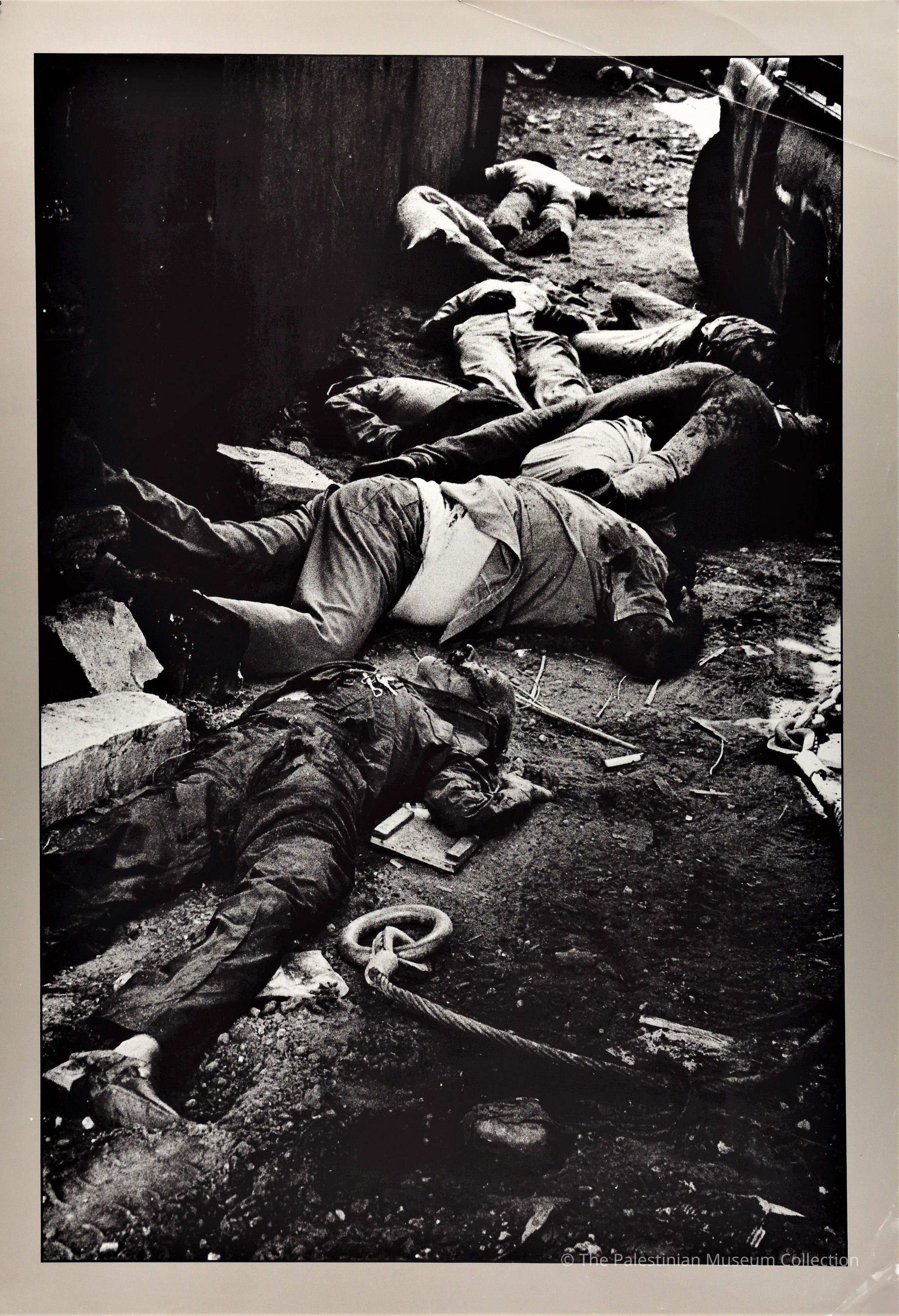 ملصق يوثق صورة لمجموعة من شهداء مجزرة صبرا وشاتيلا، 1982.